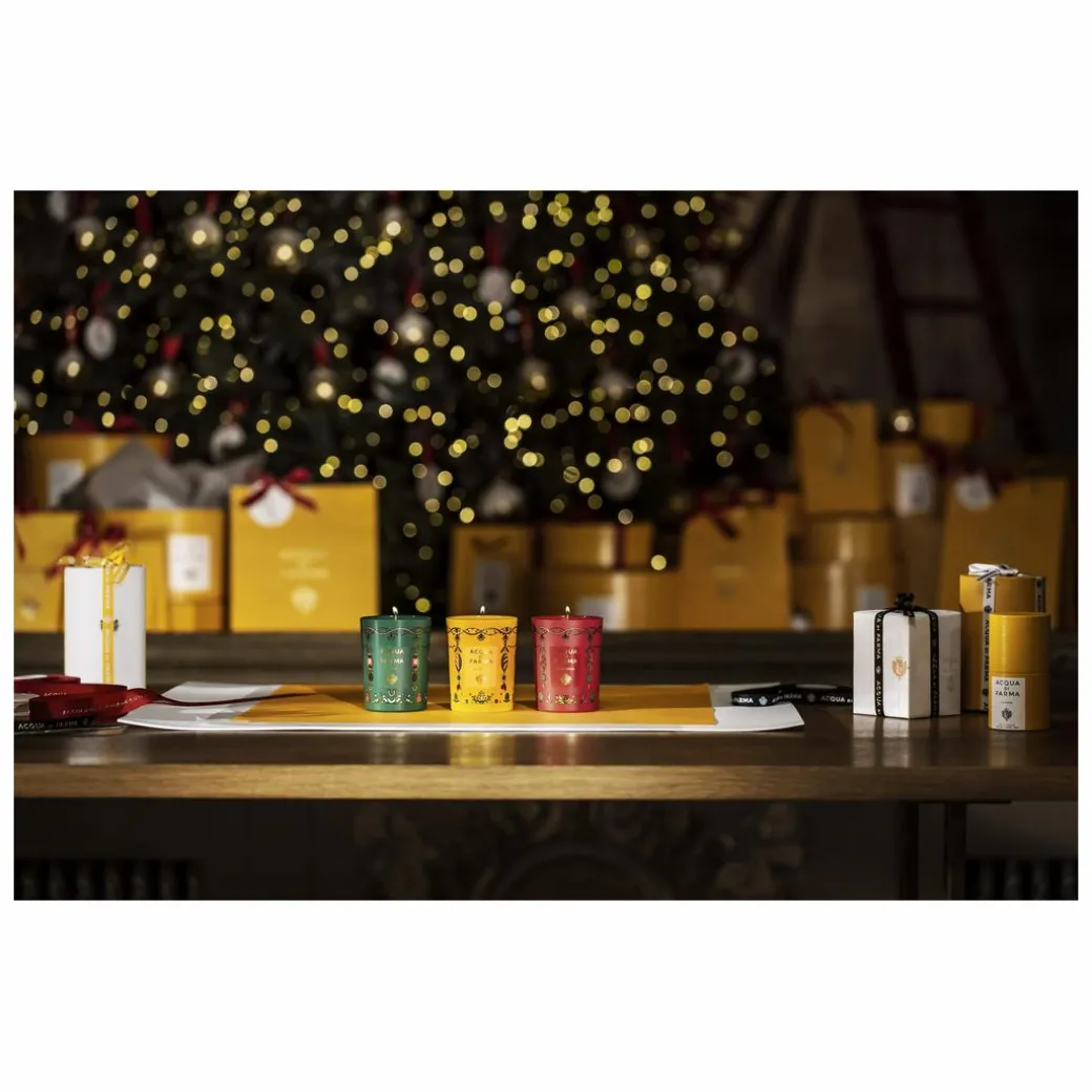 The fascinating scent of fir trees and the green facet of frosted pine needles in the Bosco candle capture the essence of a magical forest.Neve Fresca exudes the luminous beauty of freshly fallen snow, creating an atmosphere of pure bliss while the captivating aroma of Portafortuna will fill your space with an aura of precious wishes and dreams.
