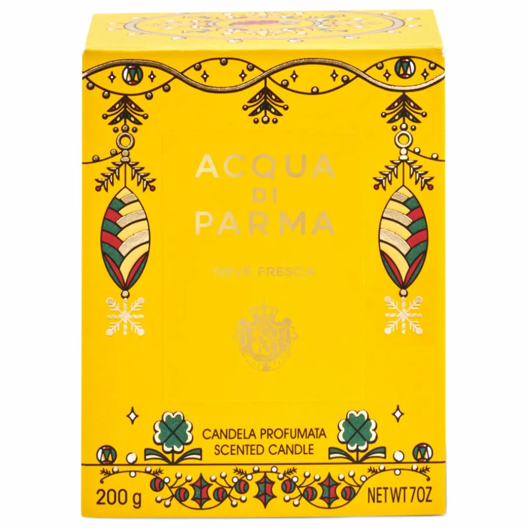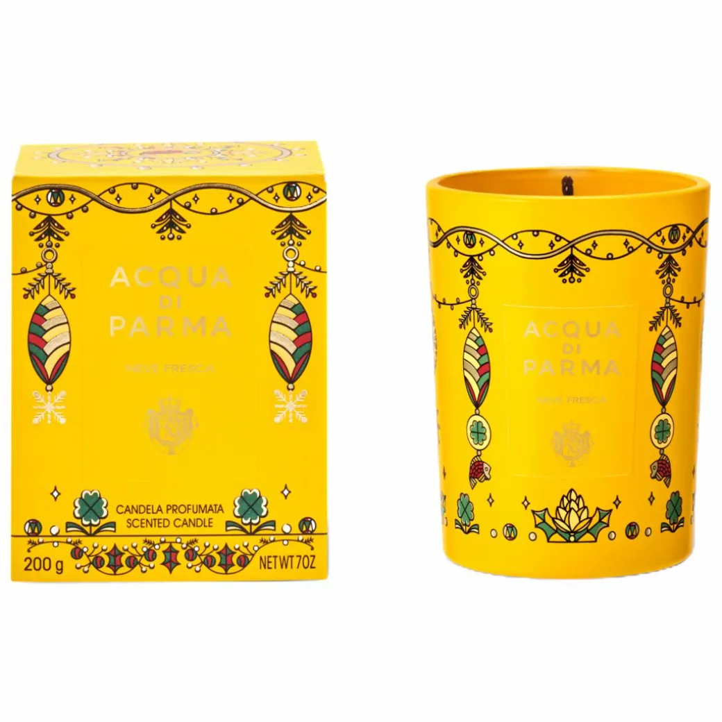Enjoy the serene winter landscape with this home fragrance composition that evokes the sight of freshly fallen snow twinkling in the sunlight. The sparkling notes of citrus and fresh cyclamen mingle with the cosiness of cloudy musk and silky sandalwood. The limited-edition Neve Fresca scented candle in a yellow glass jar is dressed in a myriad of lucky symbols from all around the world with the goldfish as the centrepiece, a symbol of prosperity, fidelity, and wealth.