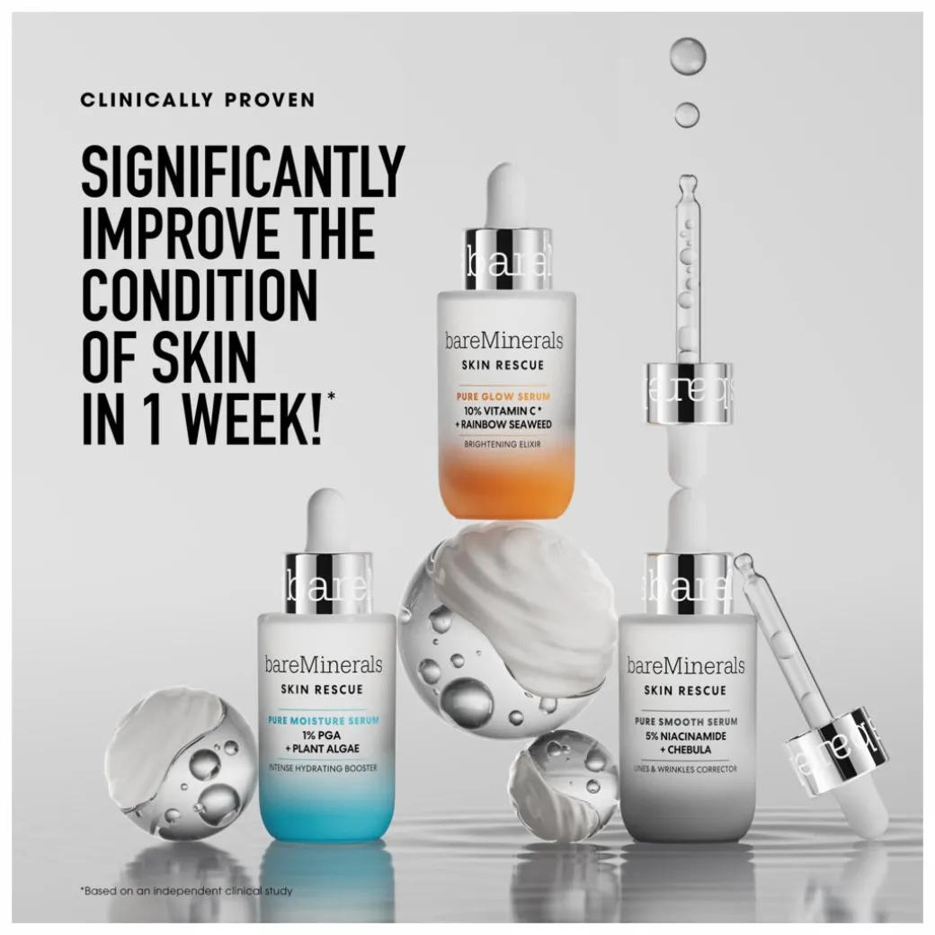 New Skin Rescue Pure Glow Serum Brightening Elixir is infused with 10% Vitamin C + Rainbow Seaweed.
