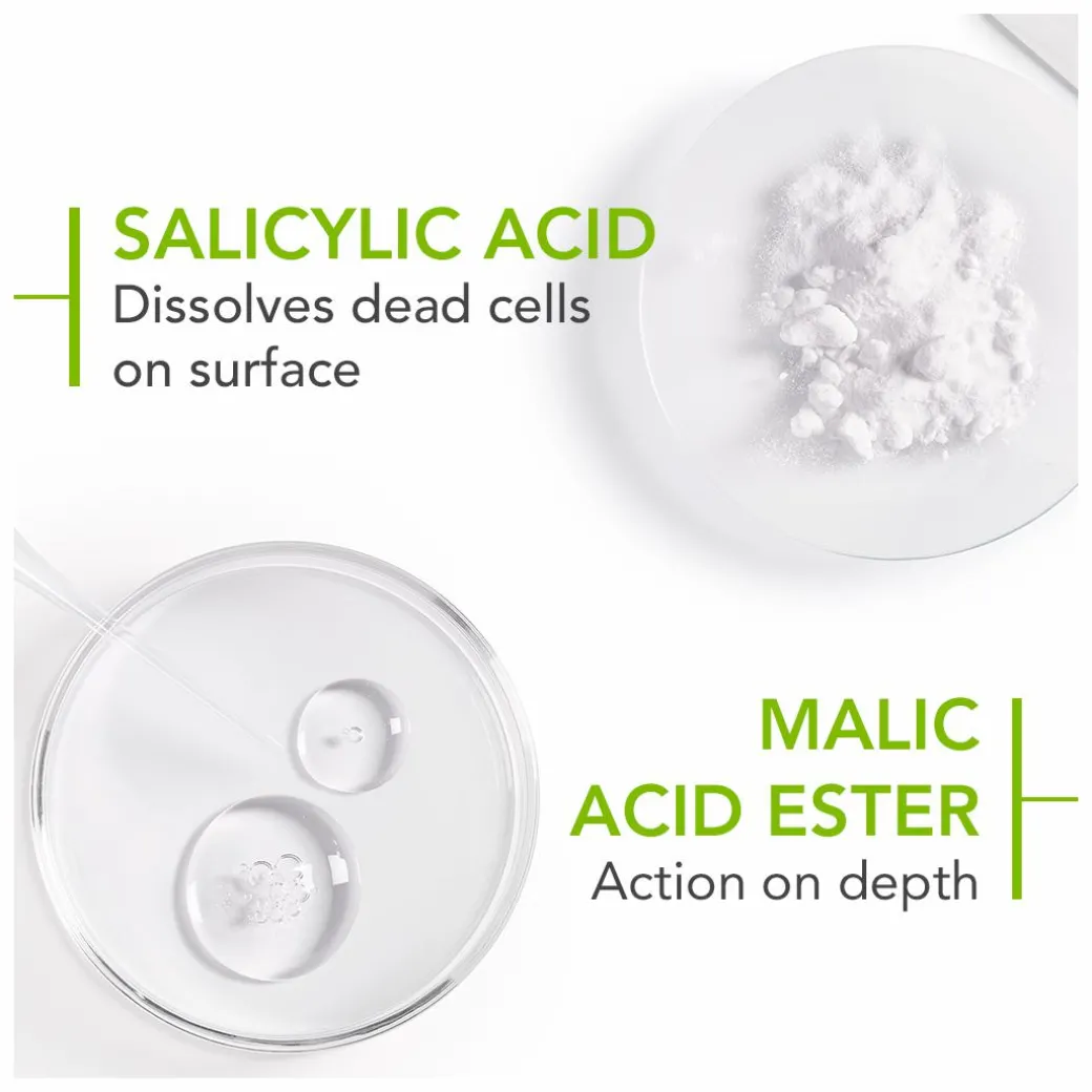 To effectively treat acne and its related issues, the formula offers a dual-action approach: surface cleaning with AHAs and deep cleansing with BHAs. AHAs, such as 10% malic acid ester and glycerin, gently exfoliate the top layer of the skin while replenishing hydration levels by locking moisture within the skin. 1.8% salicylic acid, a BHA, works in the deeper layers of the skin to unclog pores, removing dirt and excess oil.