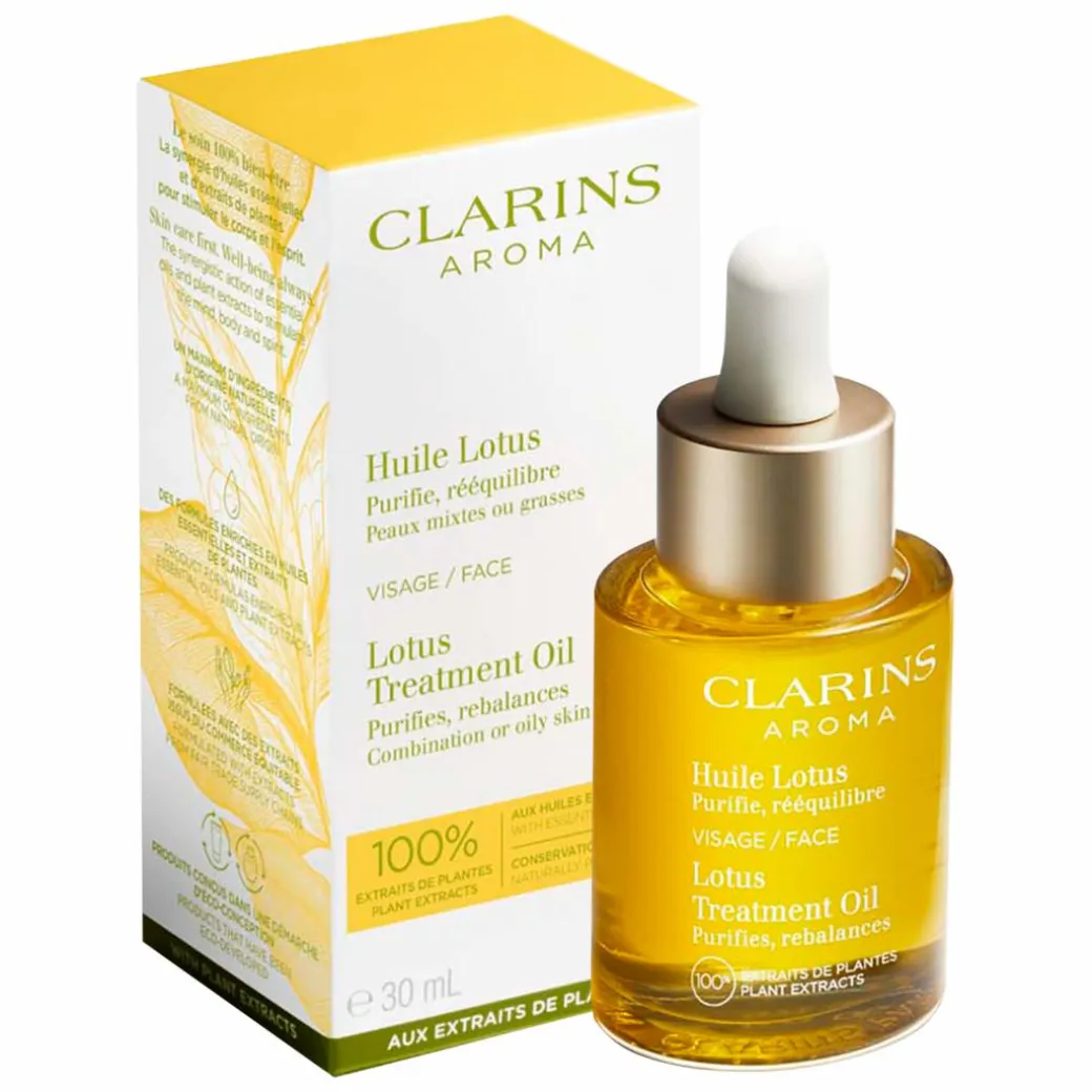 The Clarins Lotus facial oil blends high-performance skincare with the mood-boosting benefits of aromatherapy. While releasing a natural herbaceous scent, the Lotus Face Treatment Oil for combination or oily skin uses a blend of pure plant extracts and essential oils to help balance your skin. Rosemary, clary sage and sweet-scented geranium essential oils unite to purify the skin while rebalancing lotus oil helps normalise serum production and refine skin texture.