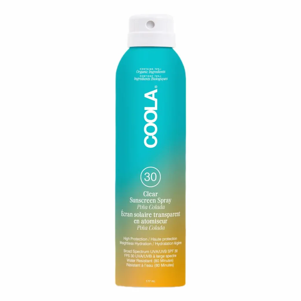 COOLA’s water-resistant, organic sunscreen spray offers strong sun protection against UVA and UVB rays with a broad spectrum SPF30.
