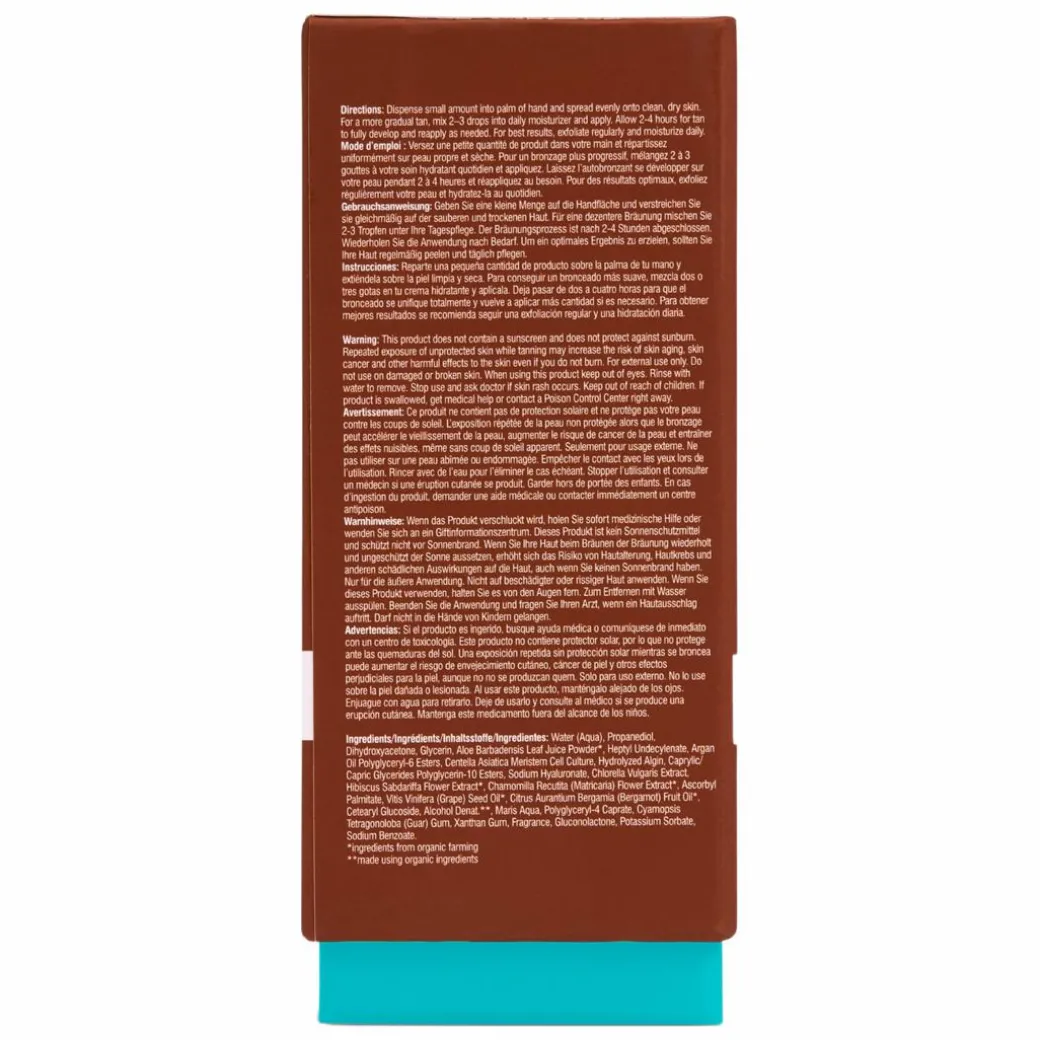 Water (Aqua), Propanediol, Dihydroxyacetone, Glycerin, Aloe Barbadensis Leaf Juice Powder*, Heptyl Undecylenate, Argan Oil, Polyglyceryl-6 Esters, Centella Asiatica Meristem Cell Culture, Hydrolyzed Algin, Caprylic/Capric Glycerides Polyglycerin-10 Esters, Sodium Hyaluronate, Chlorella Vulgaris Extract, Hibiscus Sabdariffa Flower Extract*, Chamomilla Recutita (Matricaria) Flower Extract*, Ascorbyl Palmitate, Vitis Vinifera (Grape) Seed Oil*, Citrus Aurantium Bergamia (Bergamot) Fruit Oil*, Cetearyl Glucoside, Alcohol Denat.**, Maris Aqua, Polyglyceryl-4 Caprate, Cyamopsis Tetragonoloba (Guar) Gum, Xanthan Gum, Fragrance, Gluconolactone, Potassium Sorbate, Sodium Benzoate. *ingredients from organic farming **made using organic ingredients