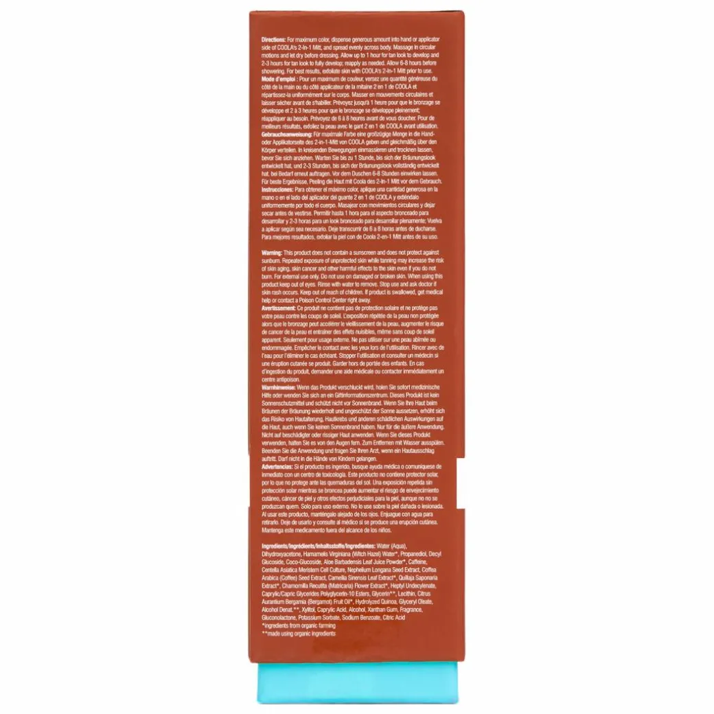 To achieve maximum colour, generously apply it to your skin and massage it in circular motions evenly across your body. Let it dry before dressing. Allow 2 to 4 hours and reapply as needed to intensify the colour. To ensure the best results, wait 6 to 8 hours before showering. If you prefer a less intense tan, mix the lotion with your favourite moisturiser before applying it. Prior to application, exfoliate your skin using COOLA’s 2-in-1 Tanning Mitt for optimal results and remember to moisturise daily to maintain the longevity of your tan.