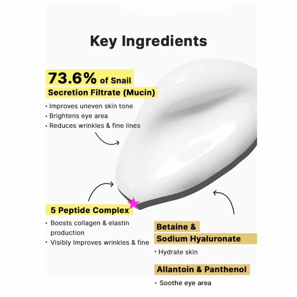 - 73.6% Snail Secretion Filtrate :Moisturize, protect and help rejuvenating the eye area