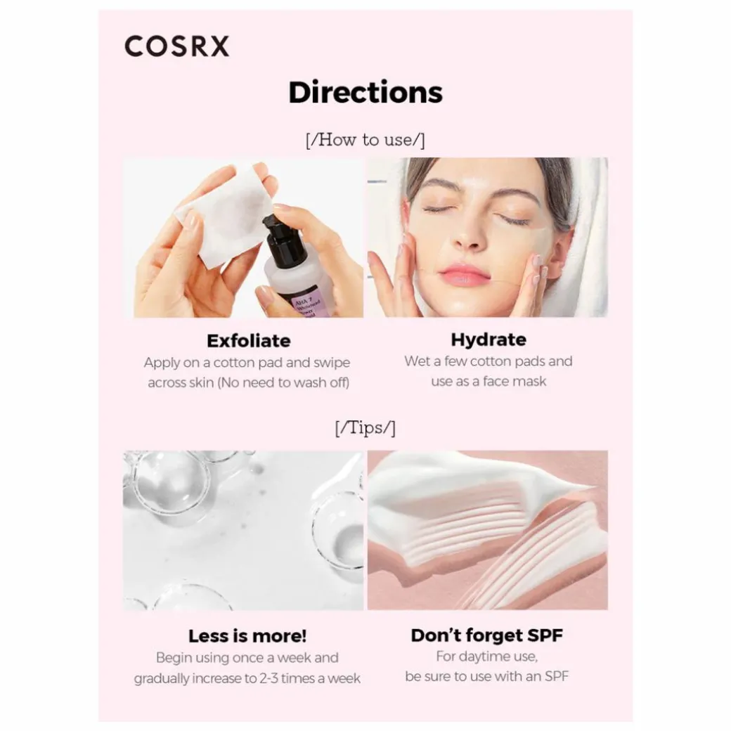 After cleansing, soak a cotton pad and swipe a thin layer of the liquid over the skin, avoiding the eye and mouth area. For use during the daytime, follow with a broad-spectrum sunscreen rated SPF 30 or greater