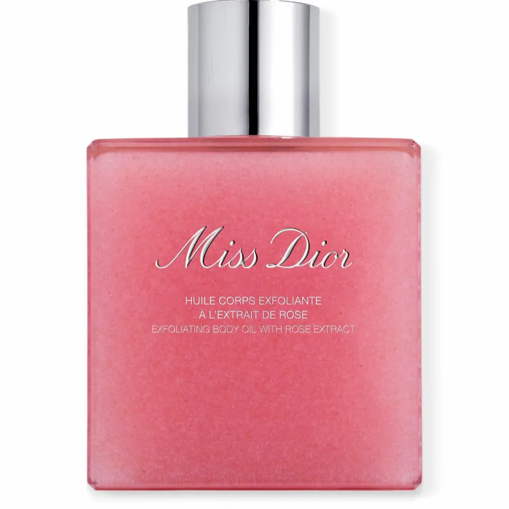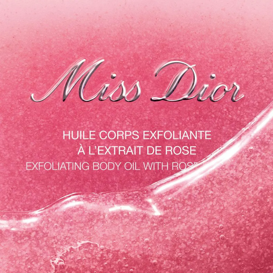 Miss Dior Exfoliating Body Oil, composed of 83 %* natural-origin ingredients, gently smooths, illuminates, and nourishes the skin.