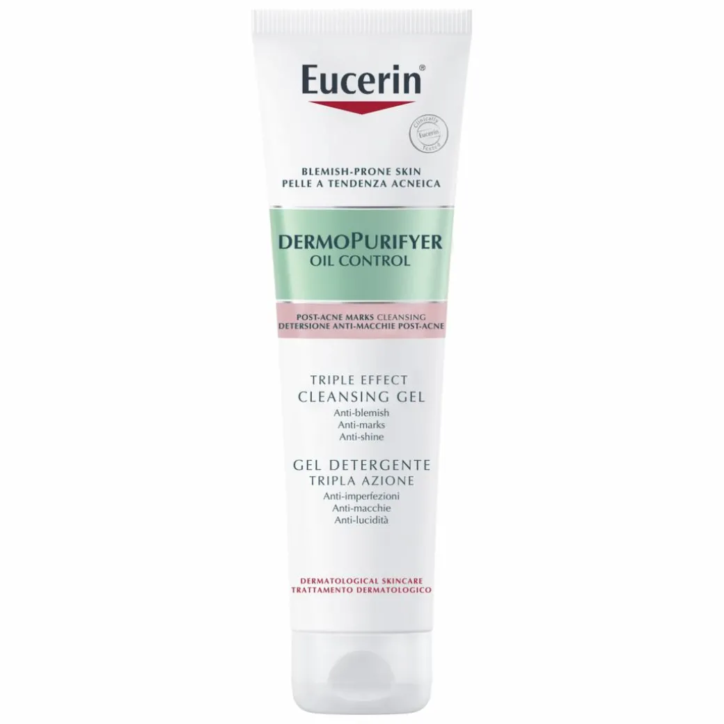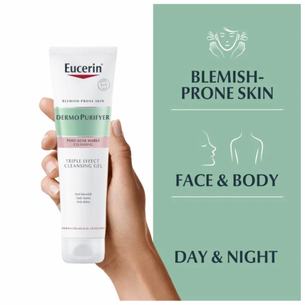 Eucerin DermoPurifyer Triple Effect Cleansing Gel exfoliates and cleanses the skin while treating post-acne marks. It has been formulated with Salicylic Acid to reduce impurities and unclog pores while several Acid Complexes remove dead skin cells as well as reduce marks. Finally, it removes excess sebum dirt along with makeup makeup, resulting in clearer skin with post-acne marks visibly reduced over time.
