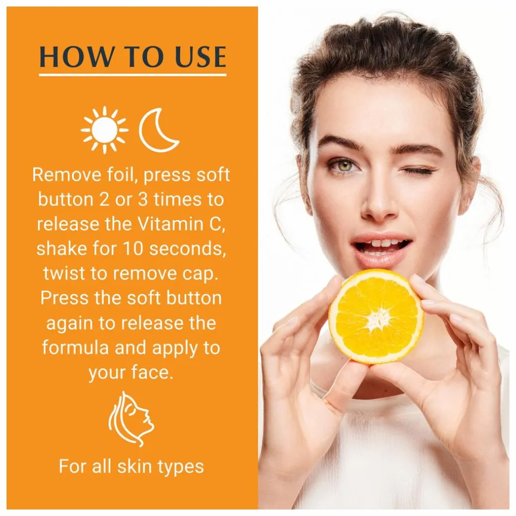 At the base of the serum, peel off the protective foil but leave the cap on. Press the button at the base two to three times to release the vitamin C. Shake the dispenser for at least 10 seconds to activate. Remove the cap at the top by twisting it, and press the button at the base to release the formula onto the tip of a finger before applying it to skin.