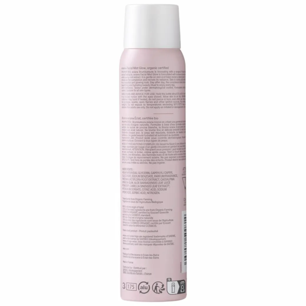 evian Facial Mist Glow is formulated with evianĀ® natural mineral water, white peony root extract and organic white tea leaf extract. It is gentle on skin and helps reveal a natural glow.