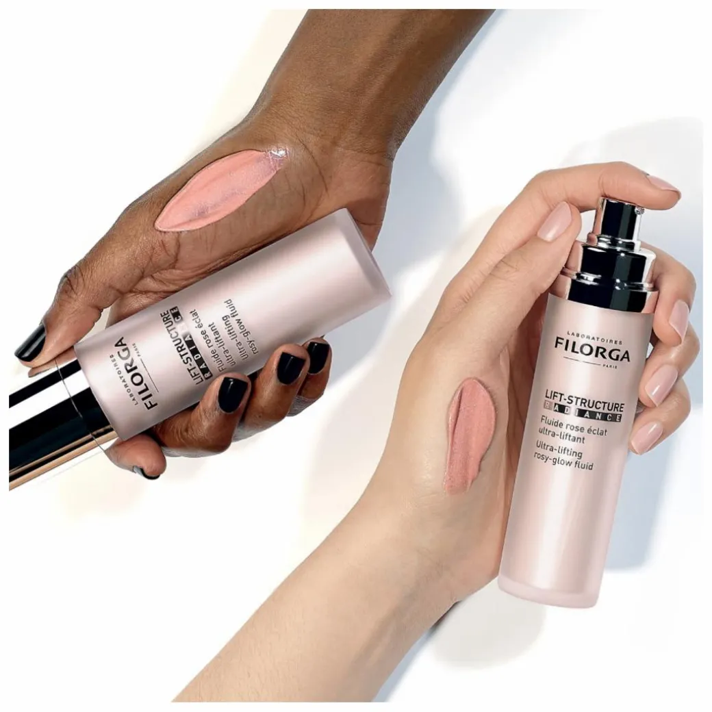 Filorga Lift-Structure Radiance Ultra-Lifting Rosy-Glow Fluid is applied in the morning over the entire face.