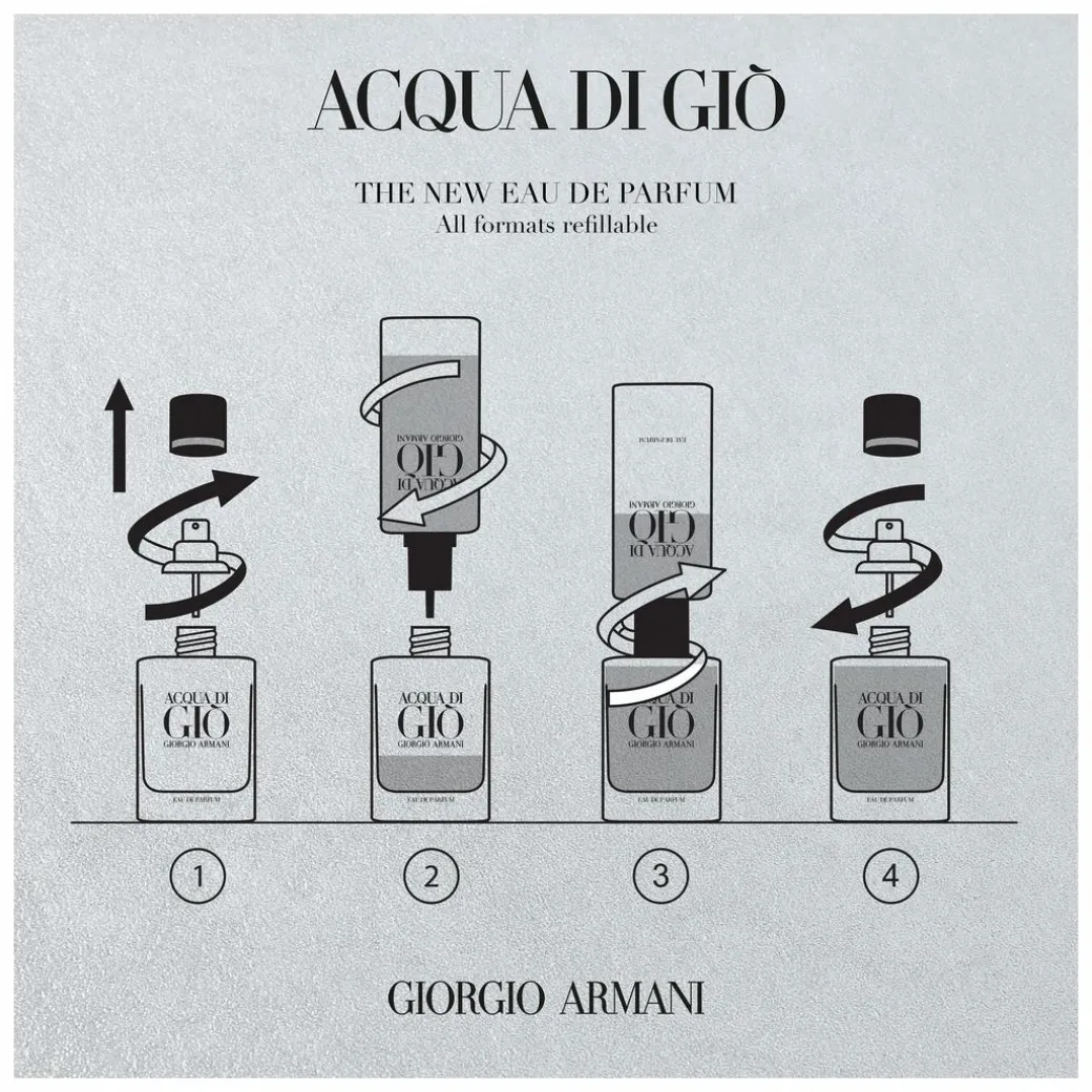 Remove the spray nozzle from your empty original Acqua Di Gio bottle. Screw the refill into the old bottle and the perfume will automatically stop pouring once the old bottle is full.