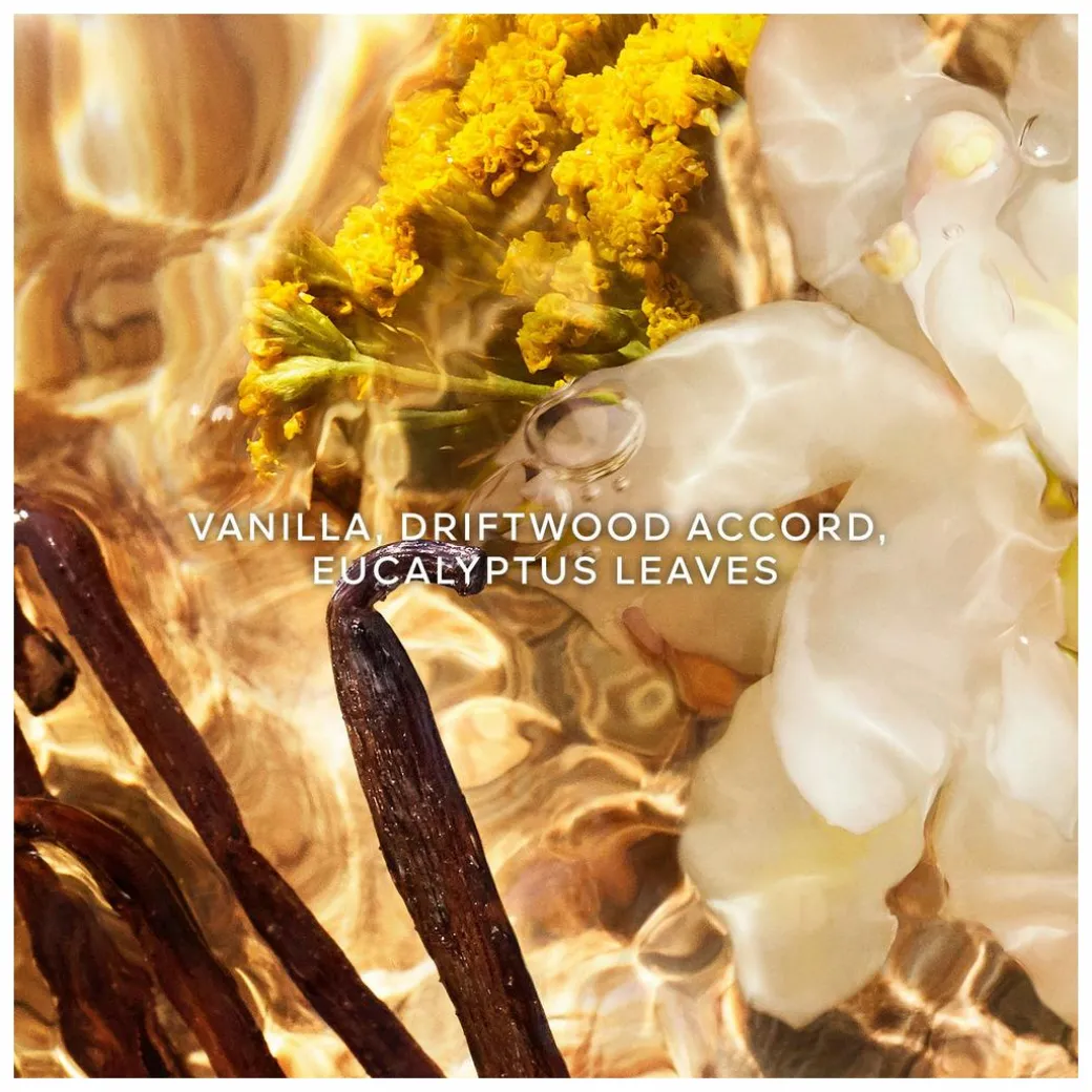 Top notes are Eucalyptus Leaves, Bitter Orange. Heart notes are Vanilla, Everlasting Flower. Base notes are Driftwood Accord, Cypress.