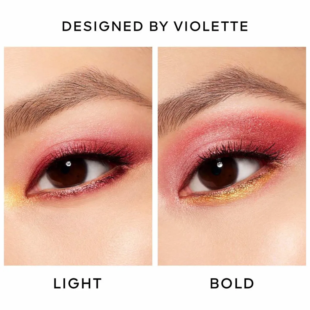 Violette, Guerlain Makeup Creative Director recommends: fresh pink on the brow bone or centre eyelid, burgundy along the lash line, coppery red under the eye and gold in the corner of the eye.