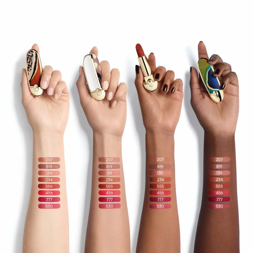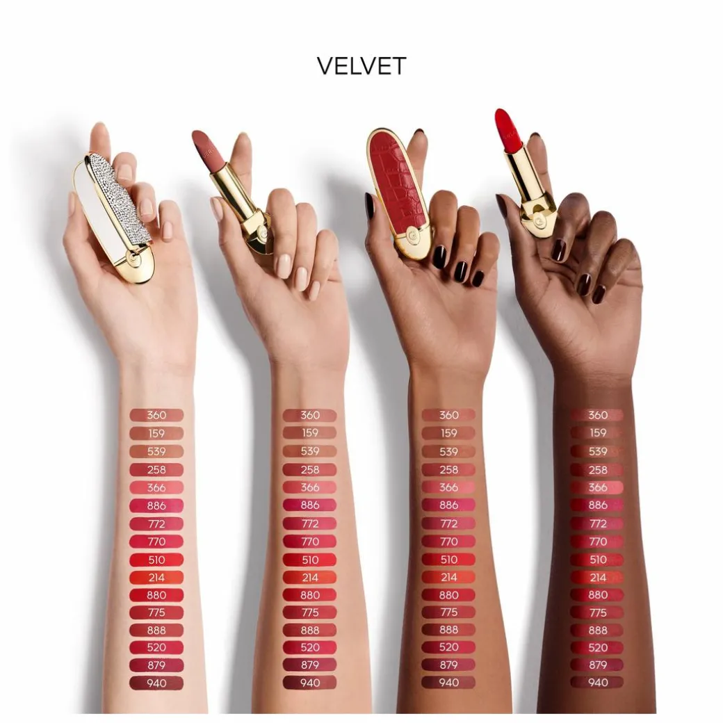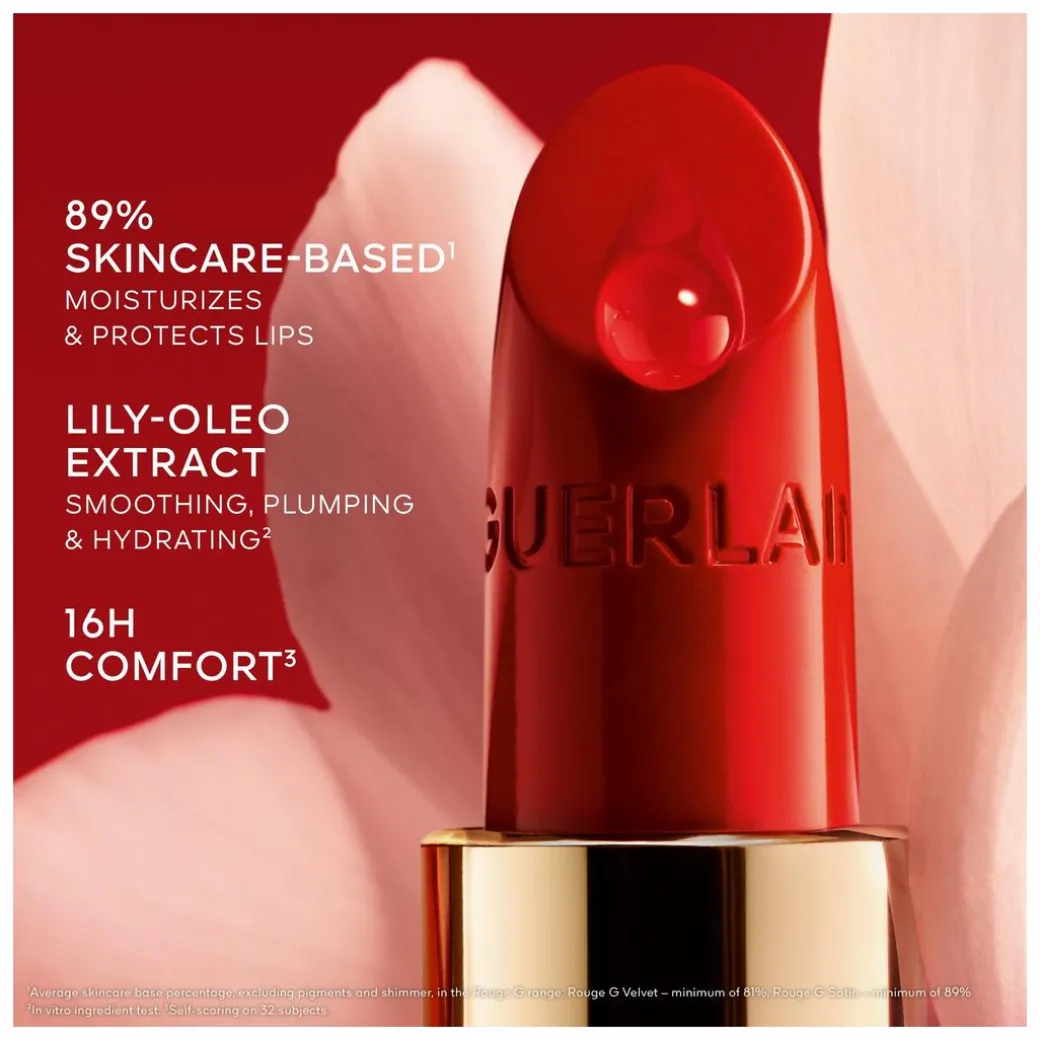 The satin and velvet matte formulas of this new-generation Rouge G boasts an ultra-light enveloping texture for a bare-lips sensation and 16-hour comfort. The satin formula coats lips in a luscious texture, leaving them plumped and perfectly shaped. Its silky finish offers a long-lasting satin sheen. The velvet matte formula smooths and coats lips in unequalled softness for a velvety result, ensuring exemplary hold for 12 hours.