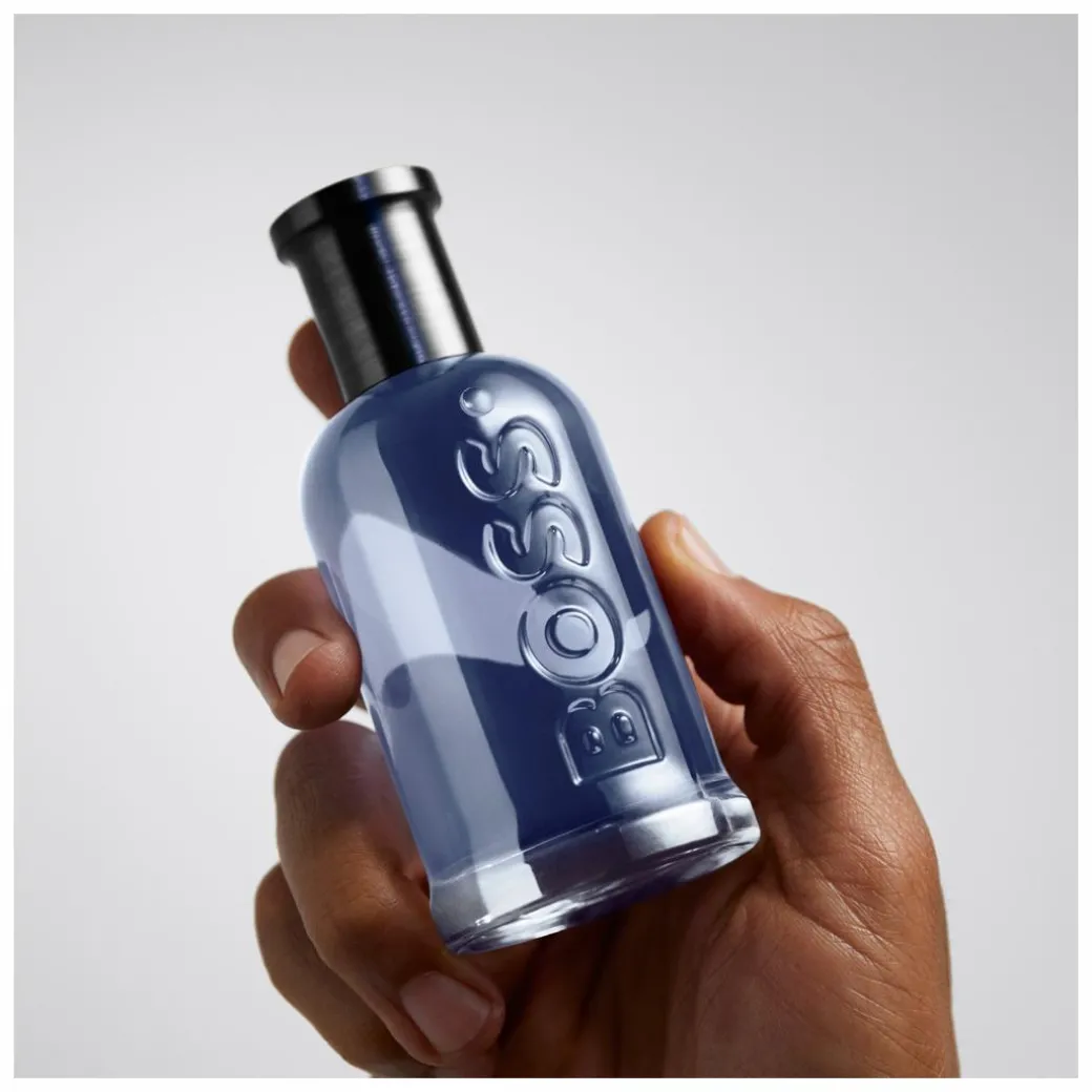- Iconic HUGO BOSS glass bottle with deep blue tones and a gunmetal top.