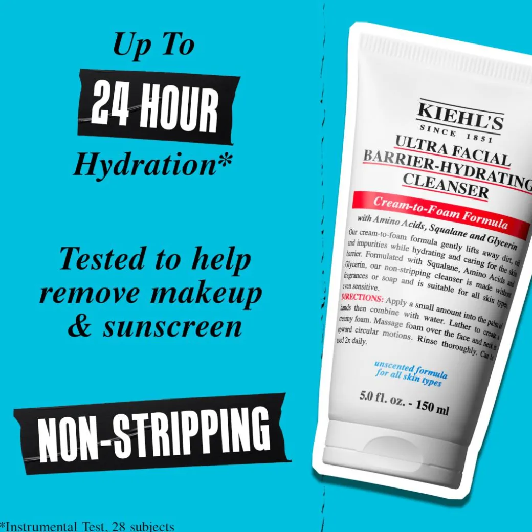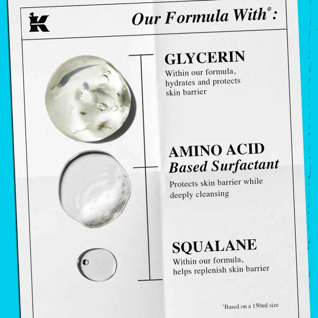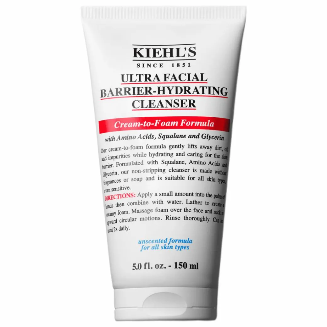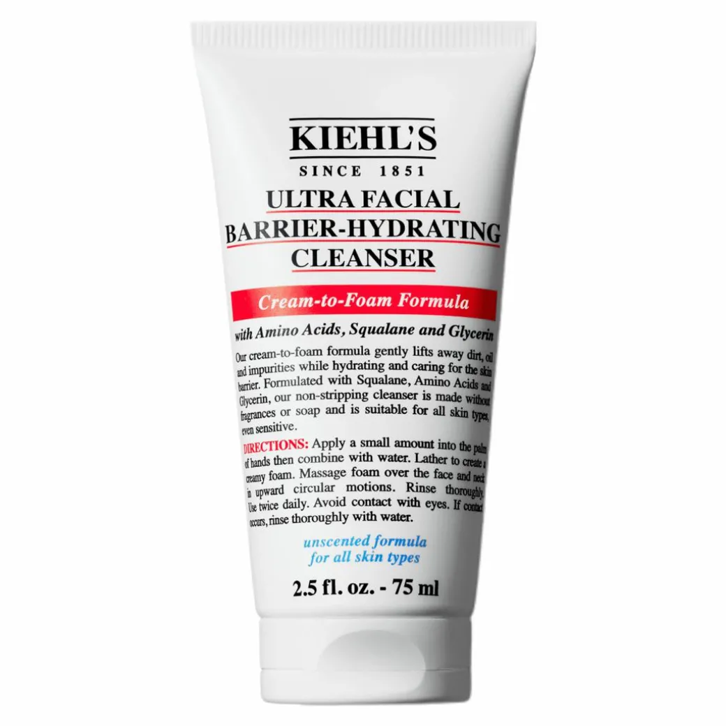Kiehl’s formula with Amino Acid, Glycerin plus Squalane, works to lift impurities and hydrate the skin barrier to help retain moisture.