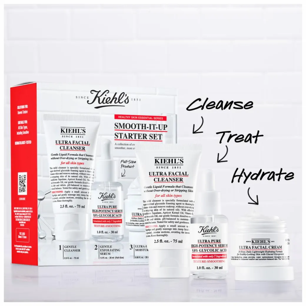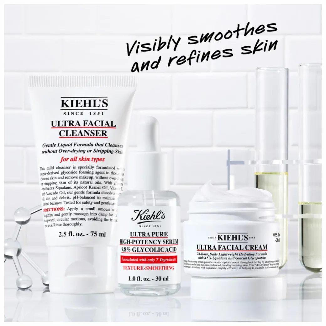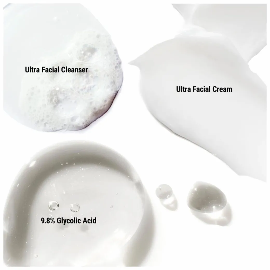 This set of skincare essentials for smooth skin features our gentle facial cleanser, minimally formulated 9.8% Glycolic Acid facial serum, and our hydrating Ultra Facial Cream, which all help visibly reduce pores and create more visibly smooth skin.