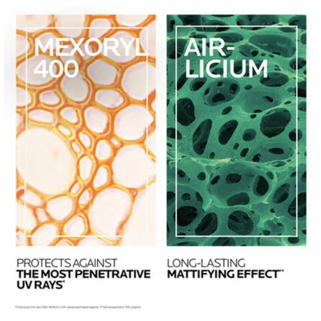 Enriched with Airlicium, the formula absorbs sebum for a long-lasting mattifying effect. Netlock Technology. Very high protection in an invisible texture in a non greasy and non sticky formula. Its micro drops group together to form a strong protection providing homogenous, non migrating and very resistant protection.