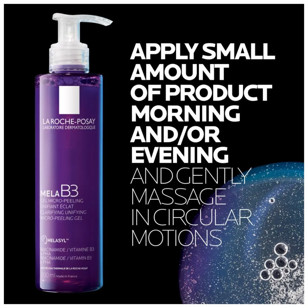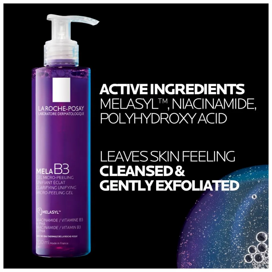 La Roche-Posay MELA B3 Clarifying Micro-peeling gel is the new cleanser from the MELA B3 range, powered by multi-patented Melasyl(TM) & Niacinamide to reduce the appearance of imperfections and leave skin looking brighter & more radiant.