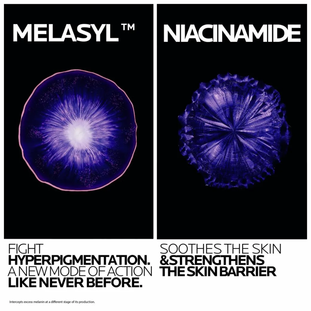 Formulated with the new patented molecule Melasyl(TM) and Pure Niacinamide, the new range helps correct the look of even the most persistent dark spots and helps stimulate the skin’s natural cell renewal process. Hyperpigmentation Innovation: new multi-patented Melasyl(TM) active.