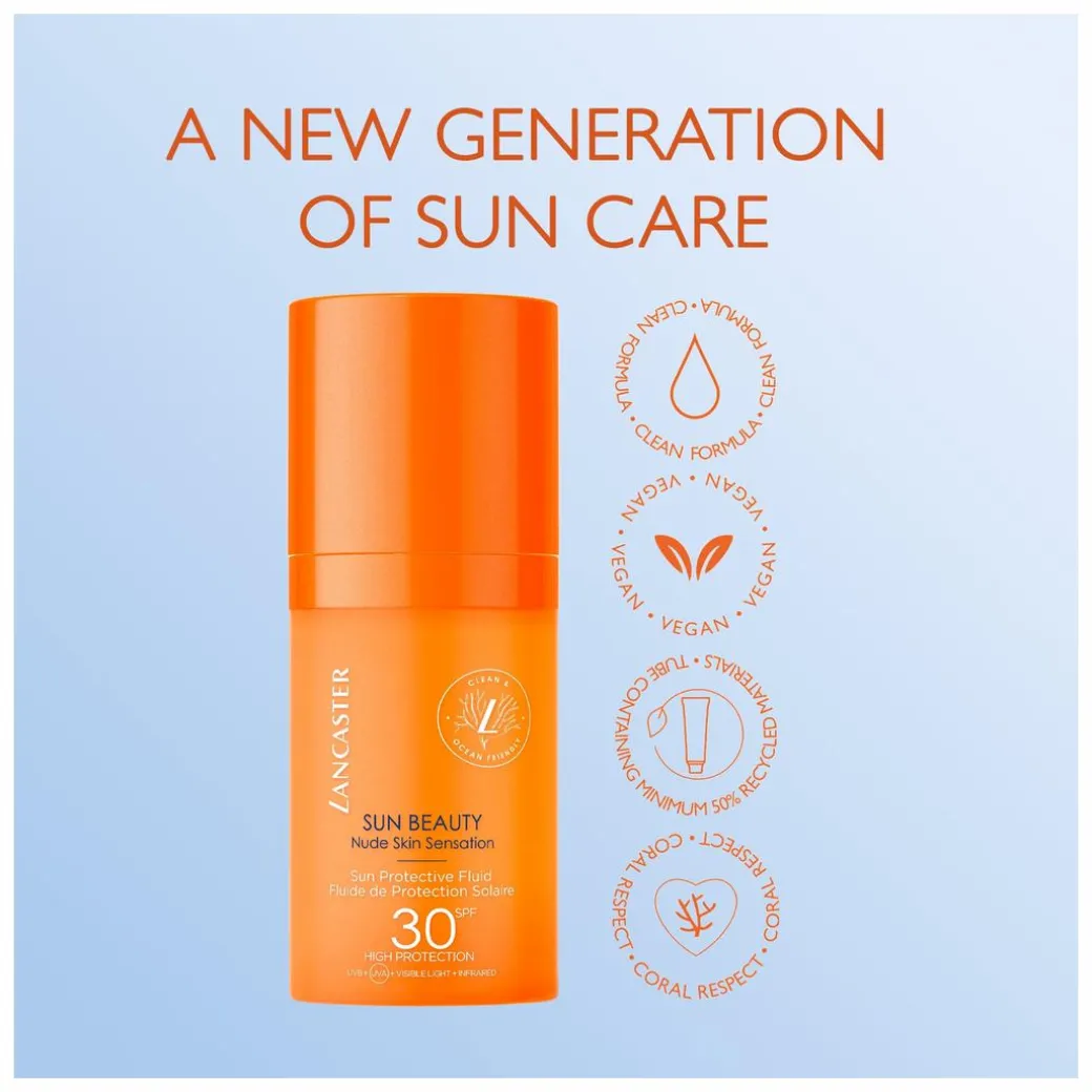 Lancaster’s Sun Beauty Fluid SPF30 features a clean, vegan and ocean-friendly formulation with a biodegradable base that respects marine life. Furthermore, the outer cardboard box is made from responsibly sourced paper, while the pump bottle contains a minimum of 50% recycled materials to help reduce the brand’s environmental impact.