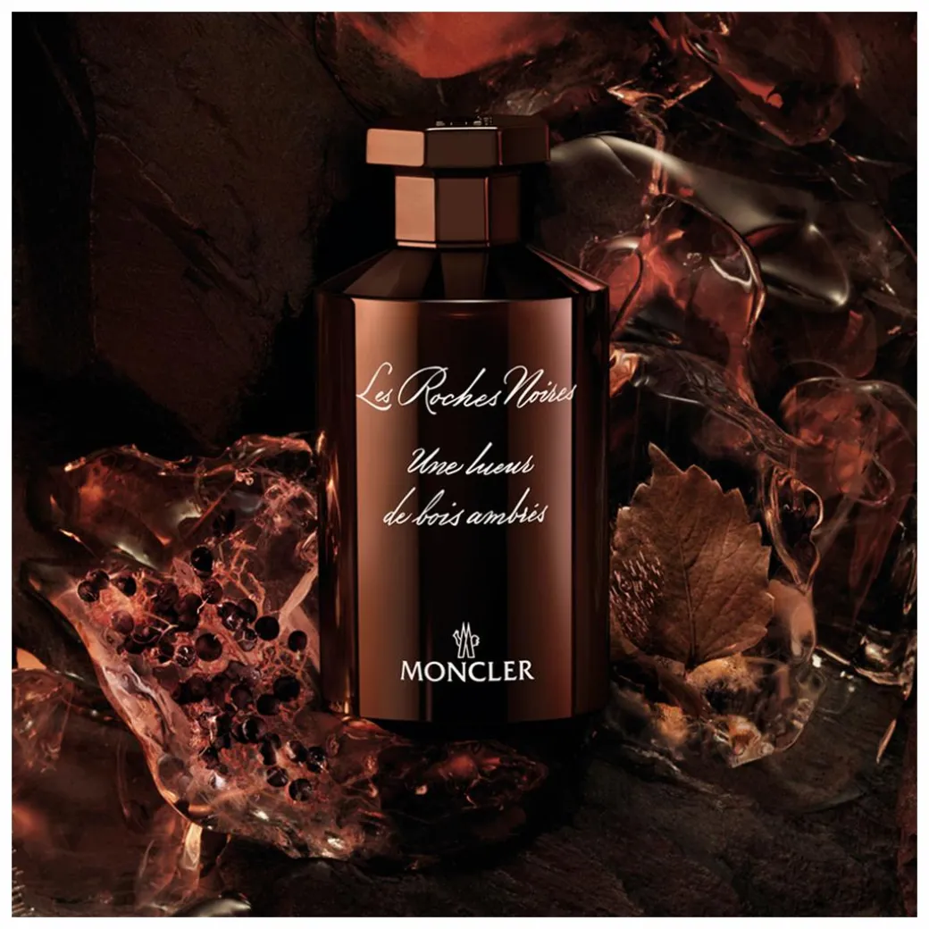 Inspired by the noble materials featured in Moncler boutiques, the bottles are a modern interpretation of traditional apothecary bottles, with an amber-brown color and facetted glass caps.