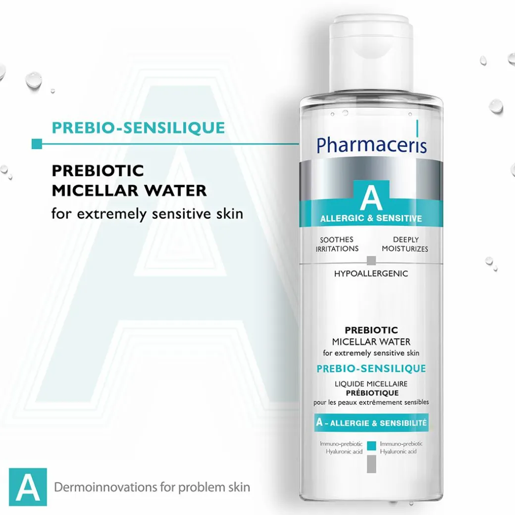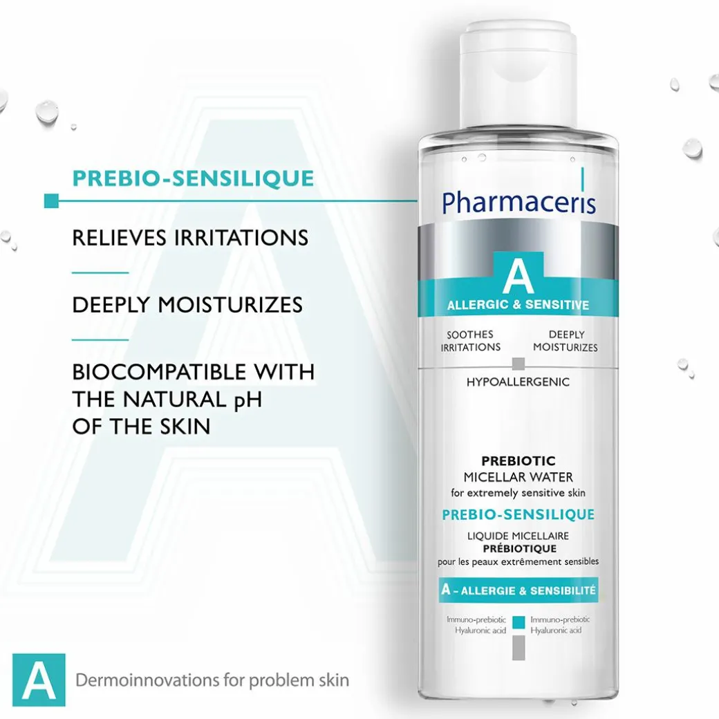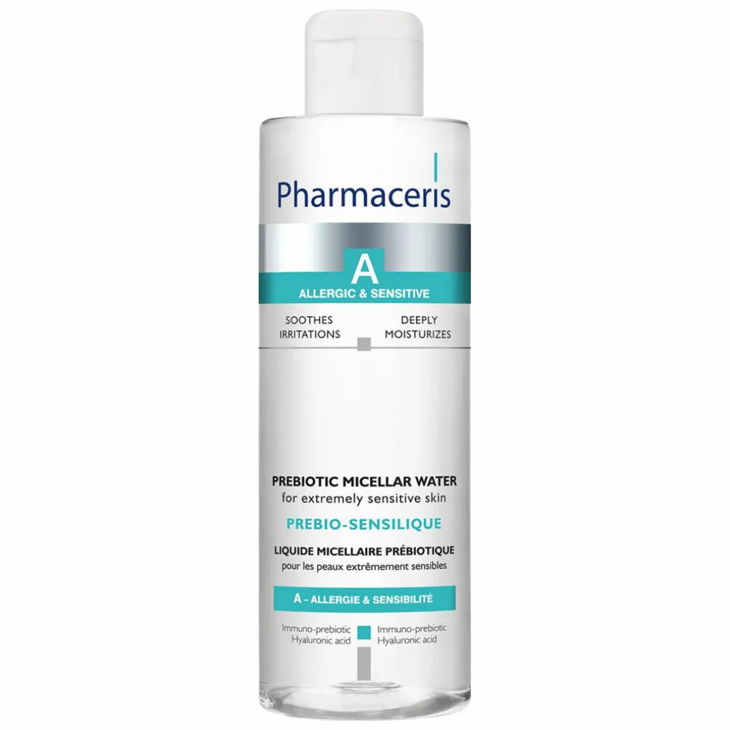 Pharmaceris A Prebio-Sensilique Prebiotic Micellar Water removes makeup and other impurities without irritating the skin or eyes. The innovative Immuno-prebiotic formula promotes the development of a natural microbial skin barrier responsible for skin immunity. Reduces hypersensitivity and restores skin balance. Hyaluronic acid ensures deep hydration, leaving a long-lasting feeling of comfort.