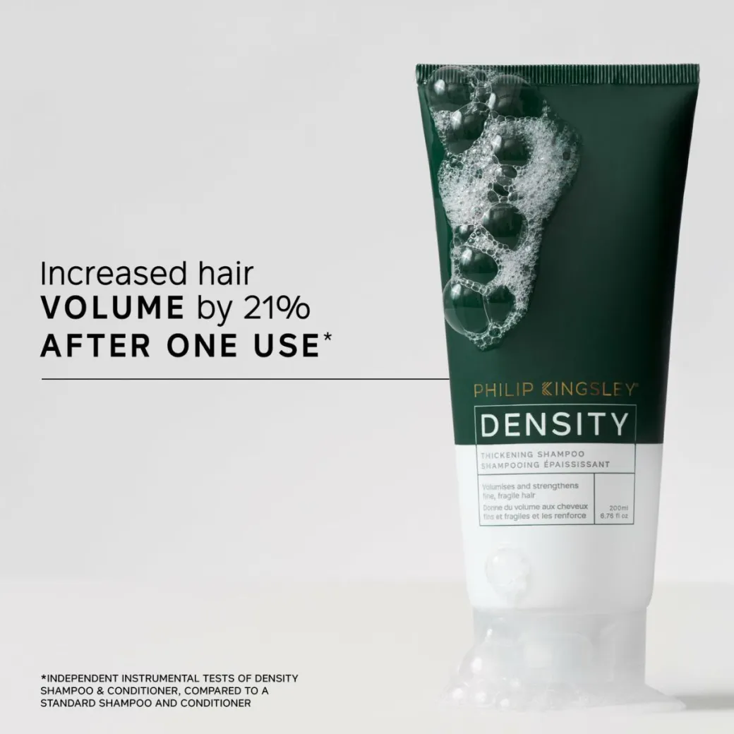 Apply the Philip Kingsley Density Thickening Shampoo to wet hair and gently knead into the scalp for 60 seconds. Create a lather before rinsing well.