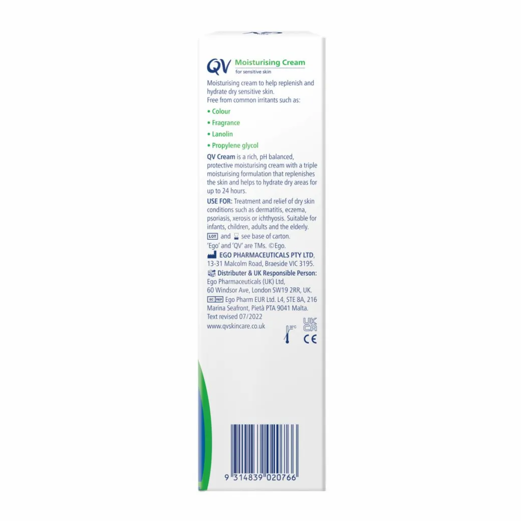 QV Moisturising Cream – 500g: Aqua (Water), Paraffinum Liquidum, Glycerin, Petrolatum, Cetearyl Alcohol, Dimethicone, Squalane, Ceteareth-20, Stearic Acid, Laureth-3, Glyceryl Stearate, Methylparaben (E218), Dichlorobenzyl Alcohol.