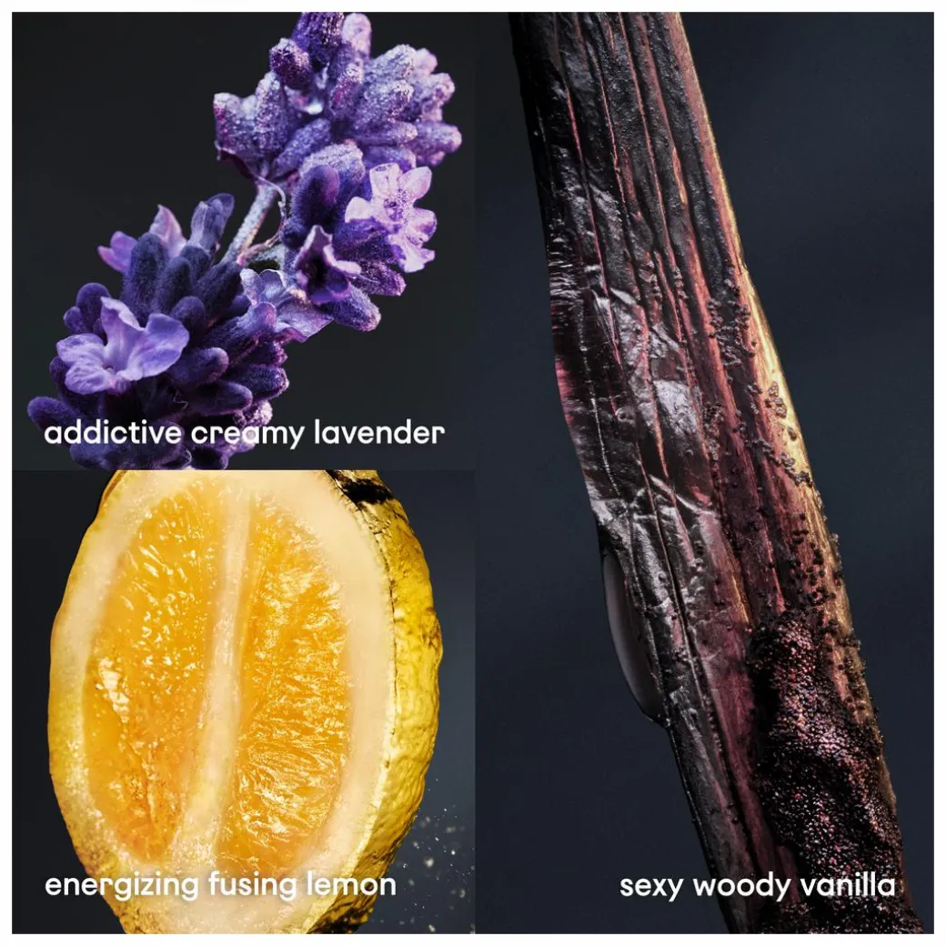 Top note is Lemon. Heart note is Lavender. Base notes are Woody Vanilla, Vetiver.