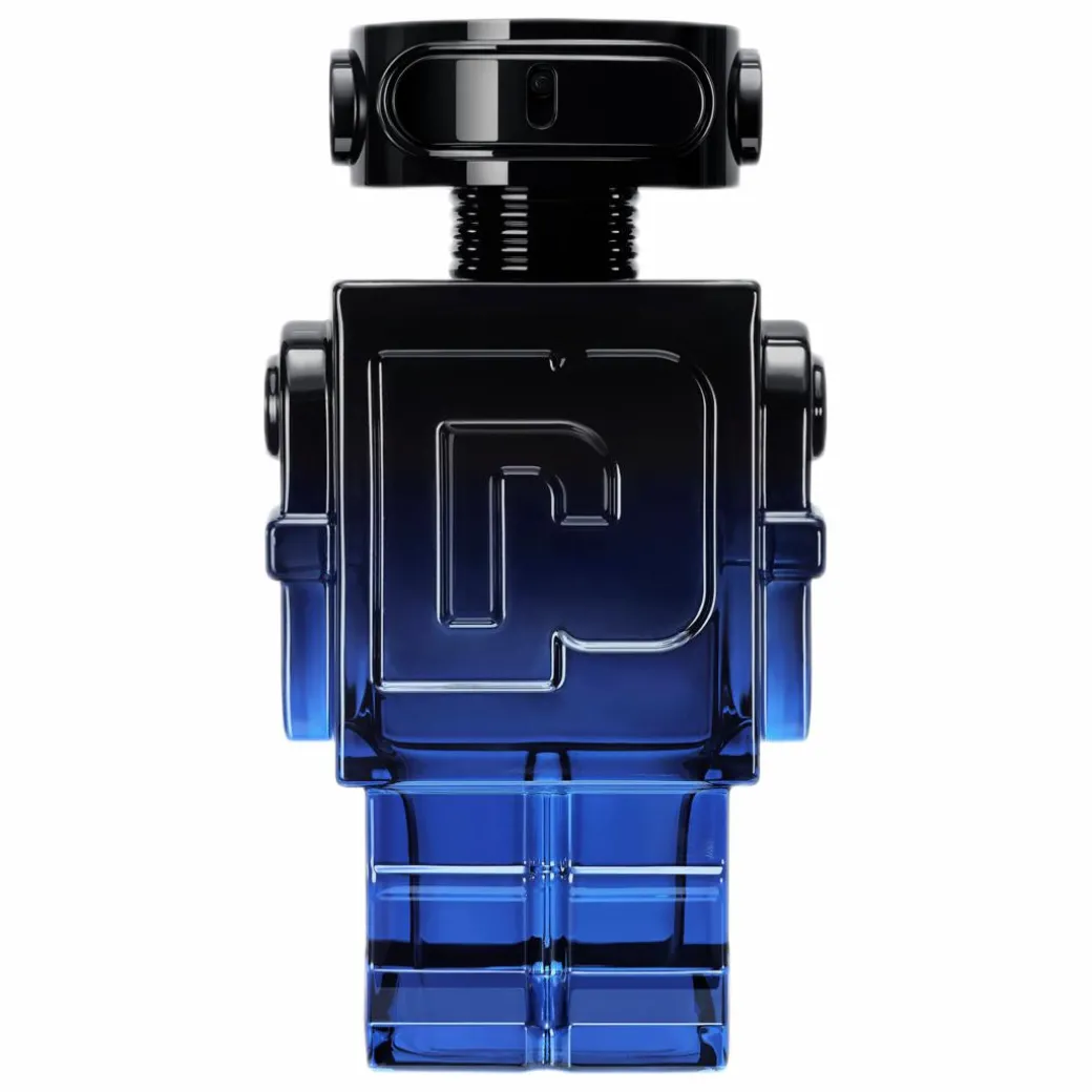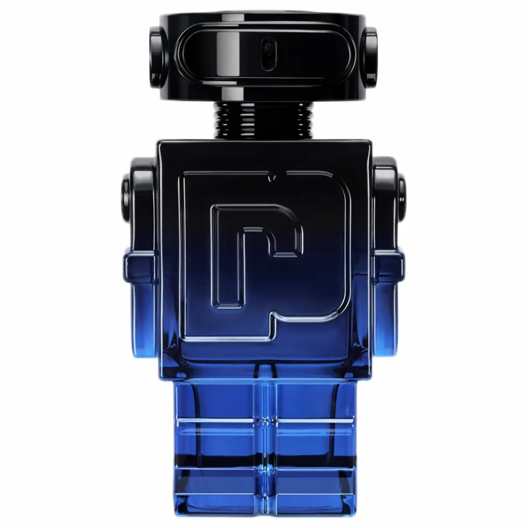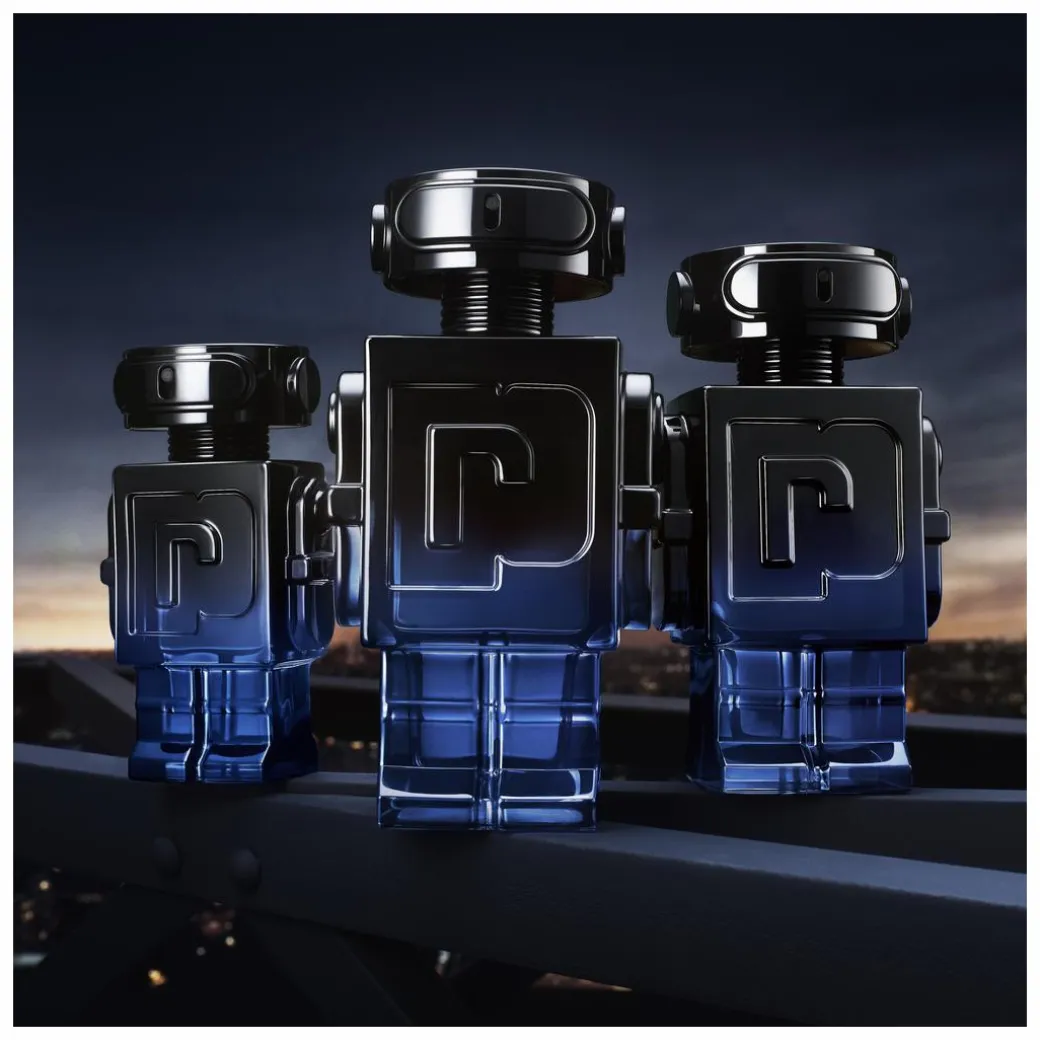 THE BOTTLE Transcending the ordinary, the Phantom Intense comes in a bold design featuring new color codes. Capturing the enigmatic spirit of the Phantom, the iconic robot transforms from fully mat black to a gradient of blues that fade, like Paris at twilight, to a powerfully masculine lacquered finish. The glossy jet black spray cap meets the high shine electric blue bottle to defy expectation as a daring new icon is born.