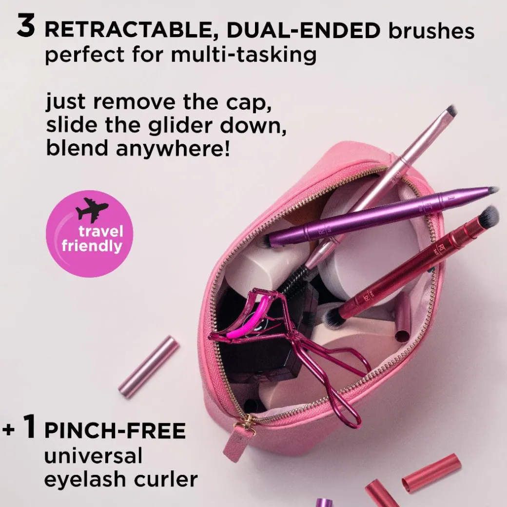 This is the perfect travel set for your next get away. This set features 3 dual-ended makeup brushes for multi-tasking and an eyelash curler for lifted lashes. Each brush includes travel caps for mess-free, easy storage.