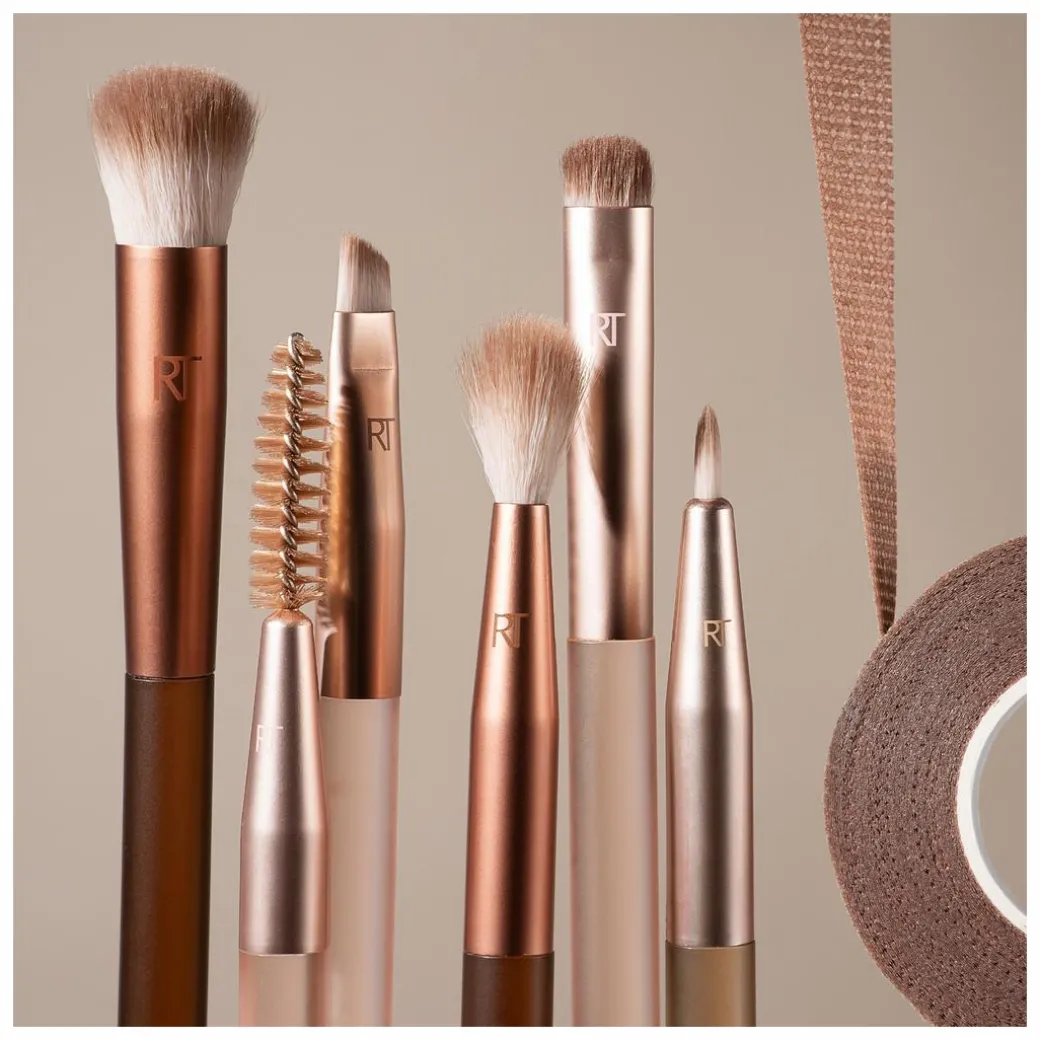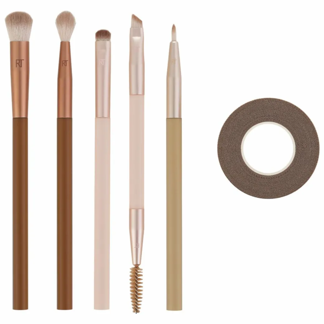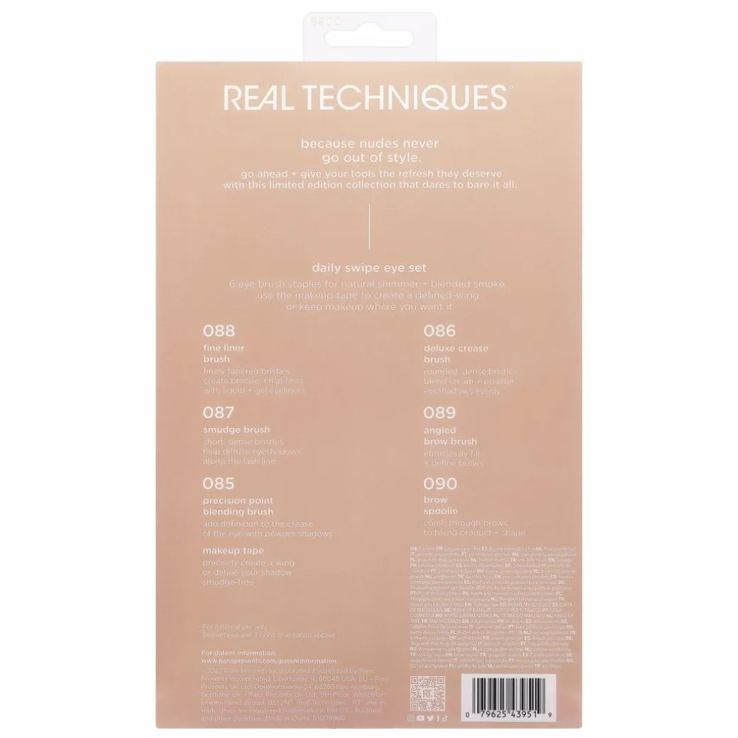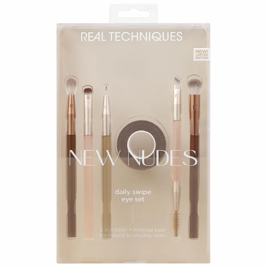 The Real Techniques New Nudes Daily Swipe Eye Set has 6 brush staples for a natural shimmer and blended smoke, as well as makeup tape to create a defined-wing or keep makeup where you want it.