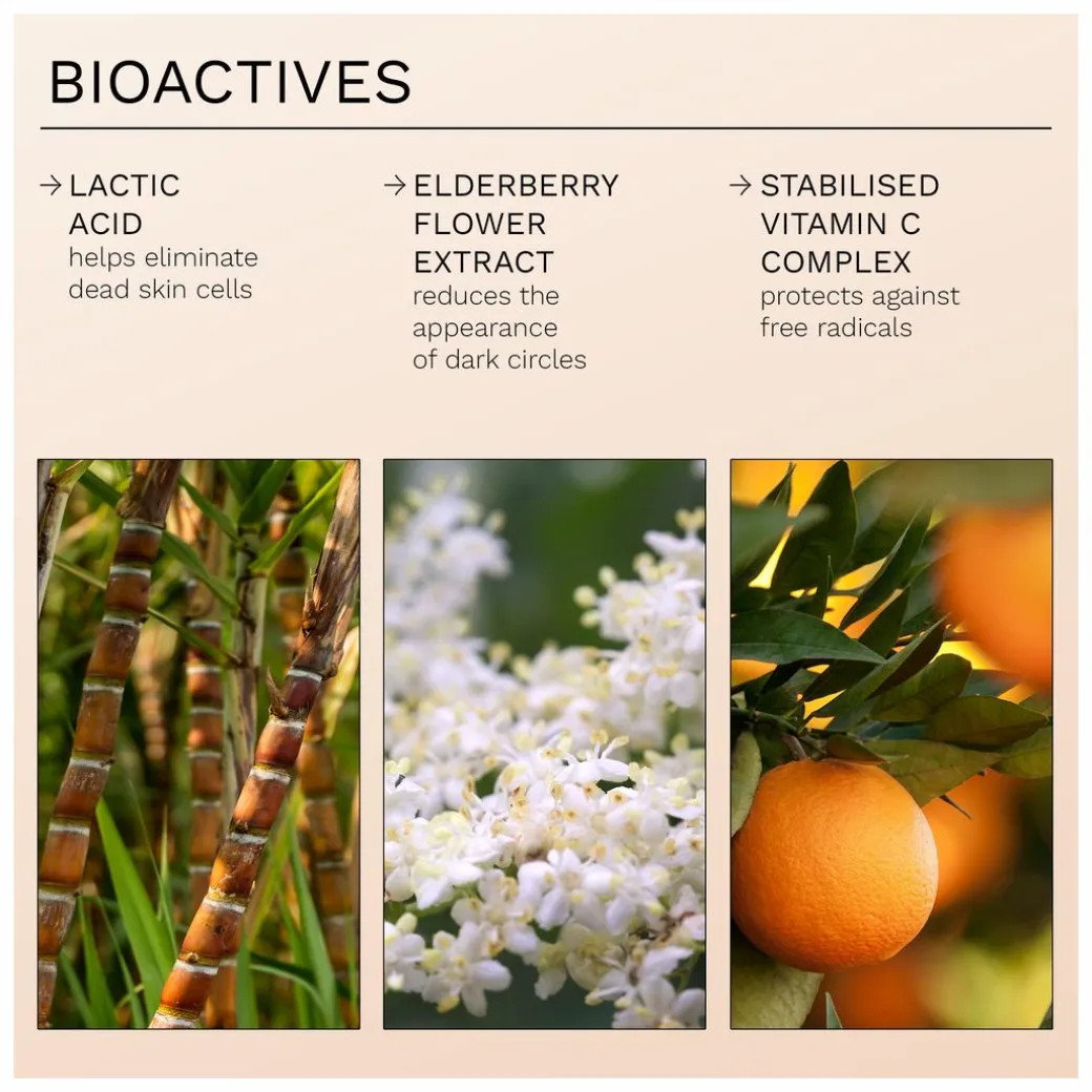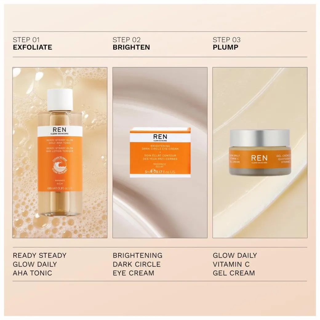 REN Brightening Dark Circle Eye Cream: Aqua (Water), Undecane, Glycerin, Caprylic/Capric Triglyceride, Tridecane, Polyglyceryl-3 Polyricinoleate, Polyglyceryl-4 Isostearate, Shea Butter Ethyl Esters, Avena Sativa (Oat) Kernel Oil, Sorbitol, Jojoba Esters, Xylitylglucoside, Silica, Sodium Chloride, Anhydroxylitol, Coco-Caprylate/Caprate, Helianthus Annuus Seed Wax, Propanediol, Benzyl Alcohol, Hydroxyacetophenone, Stearalkonium Hectorite, Xylitol, Glycogen, Polyglyceryl-3 Ricinoleate, Disteardimonium Hectorite, Sodium Hyaluronate, Propylene Carbonate, Glucose, Sambucus Nigra Flower Extract, Acacia Decurrens Flower Wax, Polyglycerin-3, Tocopherol, Citric Acid.