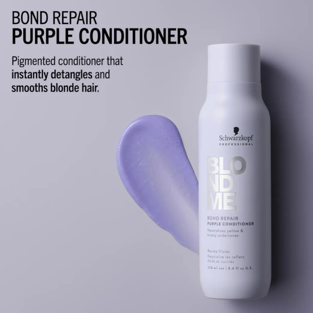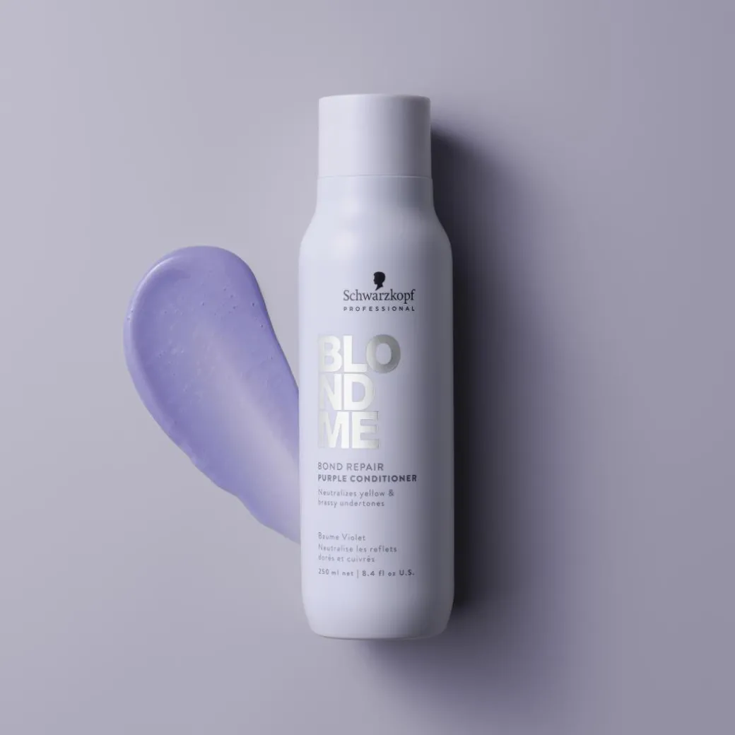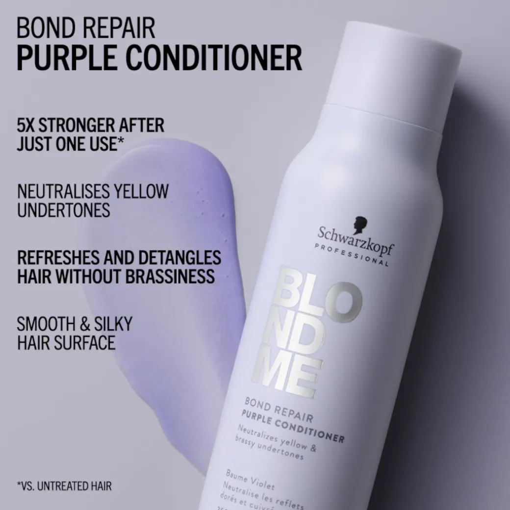Neutralising yellow undertones and helping to prevent brassiness, BlondMe Bond Repair Purple Conditioner with BOND REPAIR TECHNOLOGY intensively conditions the hair with a softening formula, instantly detangling from the lengths to ends and providing a silky feeling. Enriched with Almond Oil and Cornflower, the conditioner delivers targeted levels of cool pigments to maintain a fresh cool tone direction for improved blonde clarity, without changing the hair colour. Restoring radiance and shine, it strengthens the hair by building inner hair bonds, repairing damage equivalent to two lightening services after just one use.