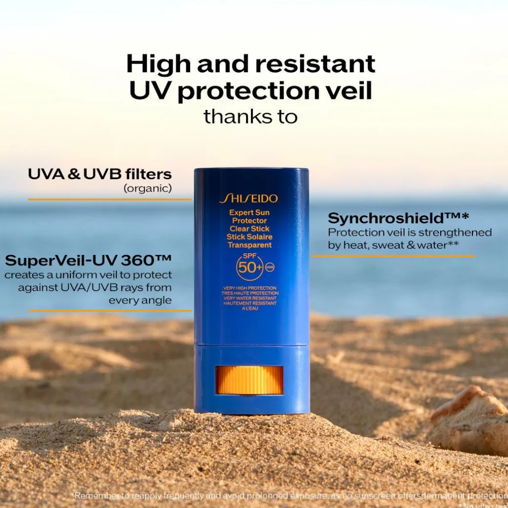 Shiseido Expert Sun Protector Clear Stick SPF 50+ is a transparent on-the-goUV protection stick that provides powerful and convenient protection all-year-roundwhilst improving the signs of againg for a healthy vibrant look.