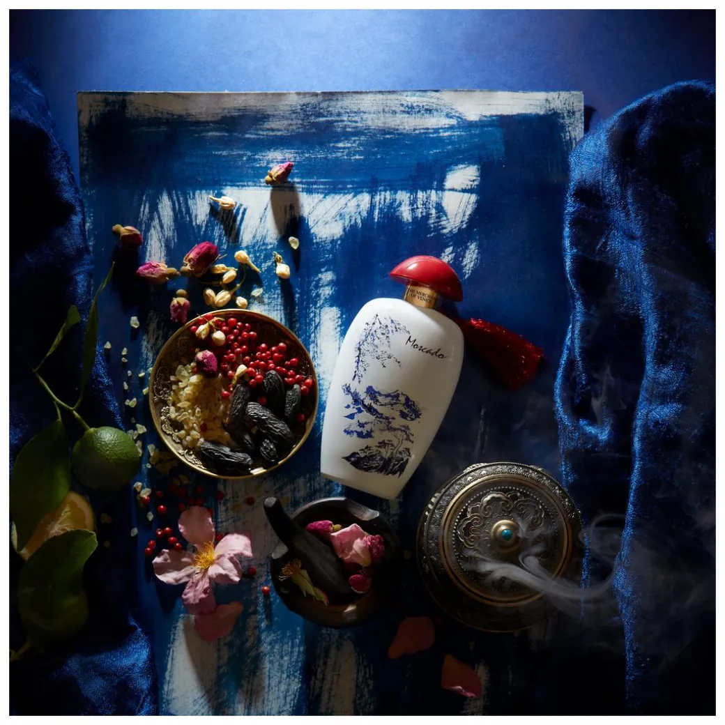 The bottle, tailor-made for the Venezia & Oriente collection, features an elegant lacquered surface with white enamel that enhances both the blue pictorial elements, outlining a mountainous landscape reminiscent of the musk’s places of origin, and the red cap and tassel.