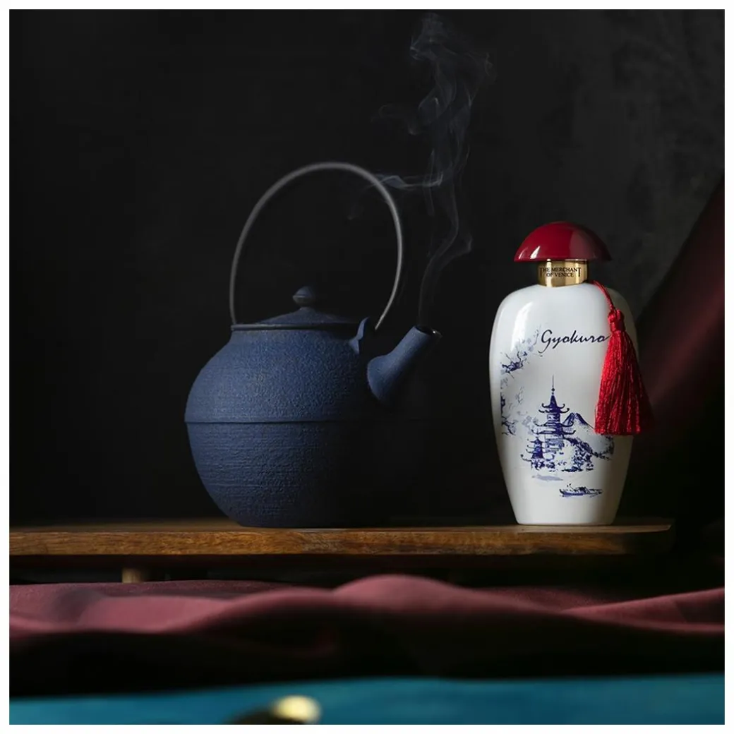 A celebration of Japan, Gyokuro is a show-stopping scent. The presentation box features an intricate red pattern on rich navy blue, parting to reveal the golden stage where the bottle stands on a bed of golden felt. The bottle itself features a beautiful painting of Japan, finished off with a red tassel.