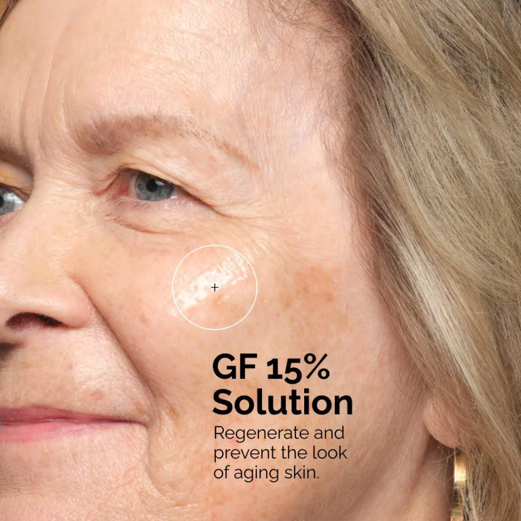 Skin naturally contains different types of growth factors, including EGF, IGF, and TGF. Growth factors for skin work to support its natural renewal. GF 15% Solution contains a 15% solution of plant-based biomimetic EGF, TGF, and IGF peptides. These offer a triple-action approach for short, mid and long-term skin renewal benefits.