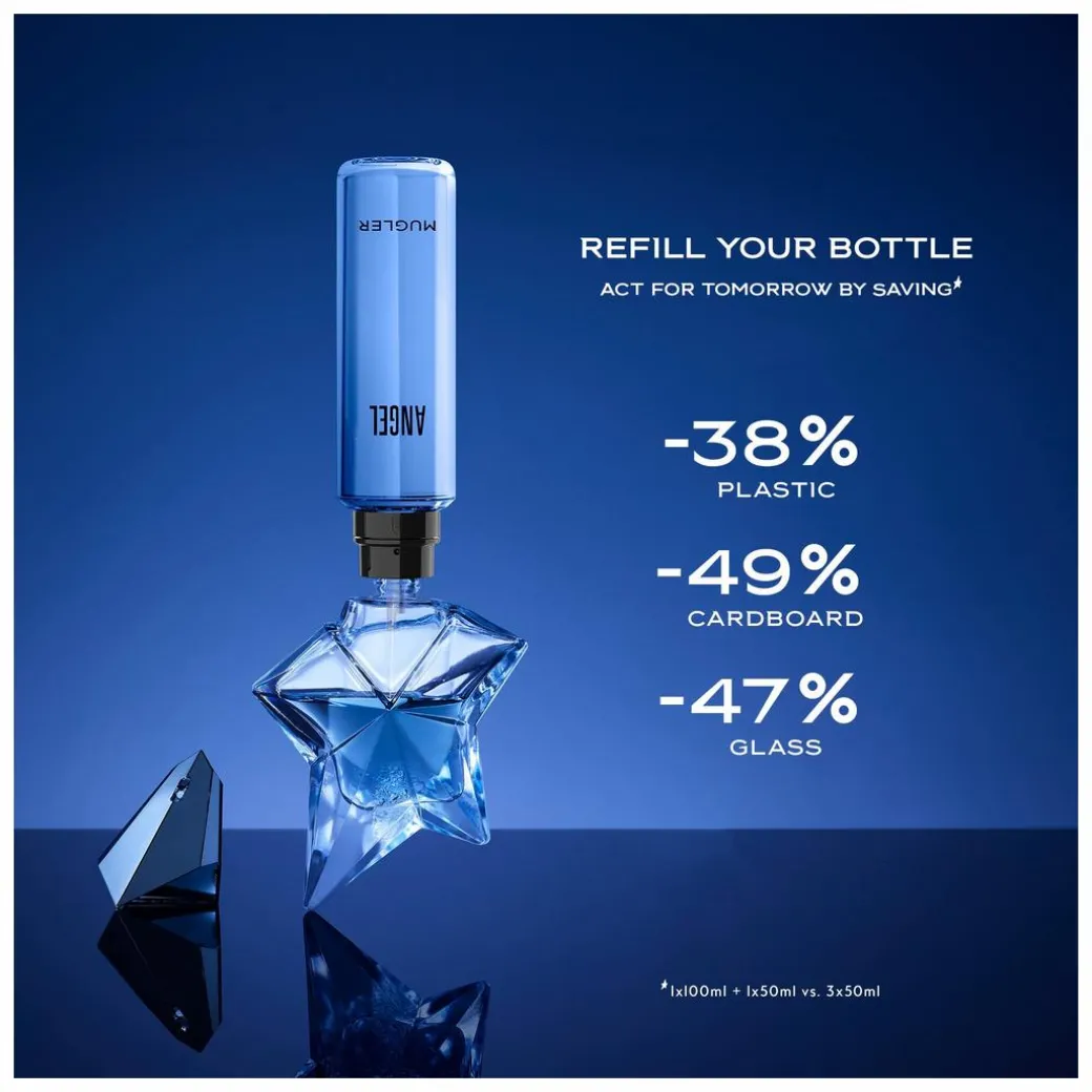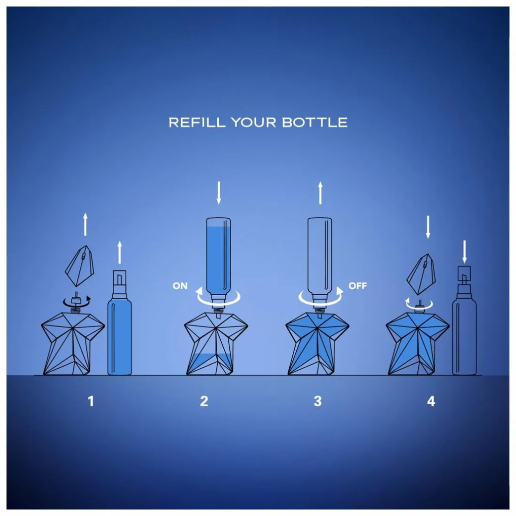 Remove the top of your existing Angel Eau de Parfum, insert a funnel and carefully refill. Once replenished, spritz the fragrance onto your pulse points to get the most out of this captivating scent.