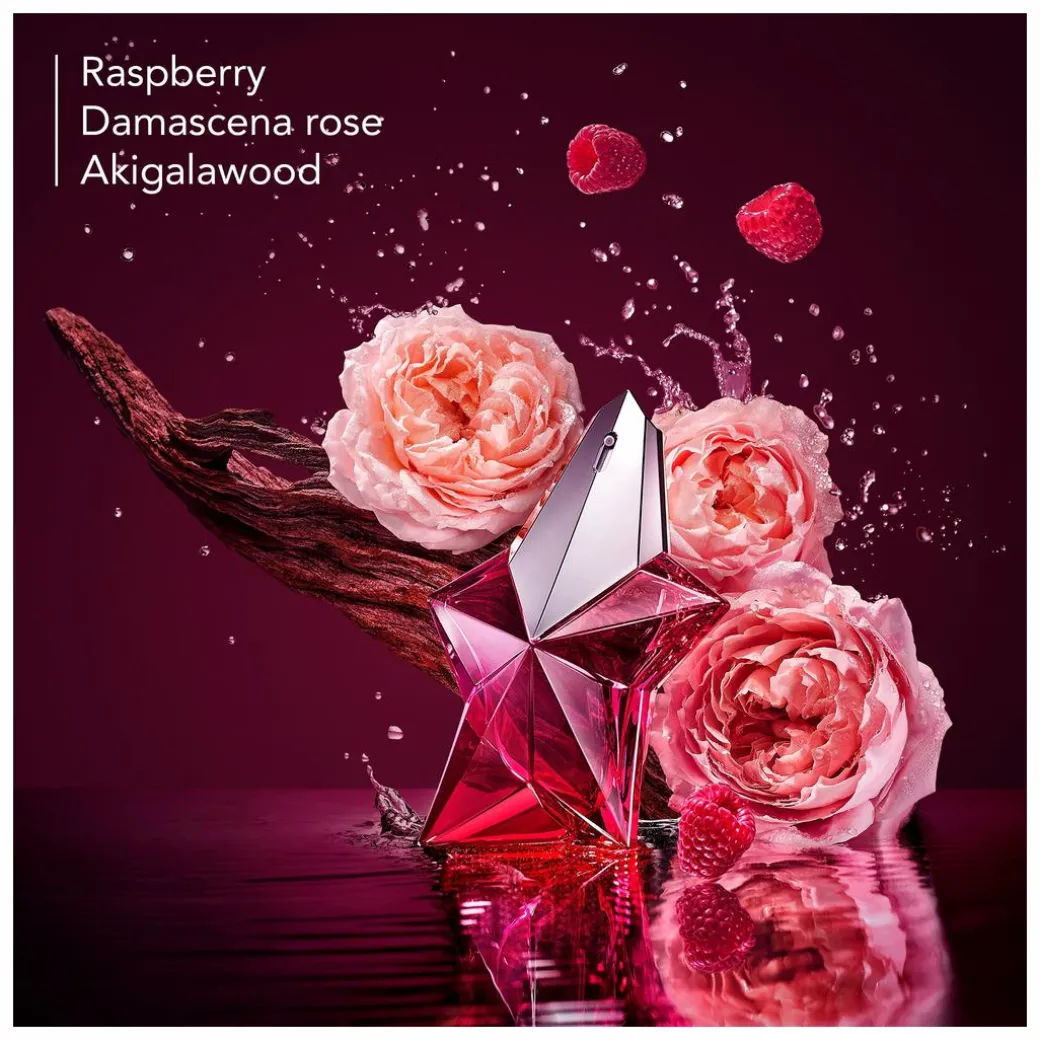 Bursting with a fresh fruity tone, Angel Nova opens with a joyful blend of sweet raspberry and juicy lychee. The Eau de Parfum then welcomes a unique floral heart centred around the romantic essence of damask rose, enhanced by upcycling to create a supernatural and sustainable rose scent.