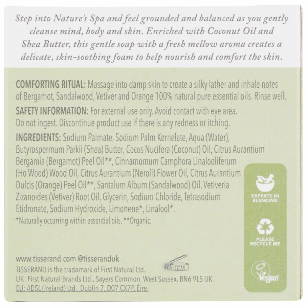 Sodium Palmate, Sodium Palm Kernelate, Aqua (Water), Butyrospermum Parkii (Shea) Butter, Cocos Nucifera (Coconut) Oil, Citrus Aurantium Bergamia (Bergamot) Peel Oil**, Cinnamomum Camphora Linalooliferum (Ho Wood) Wood Oil, Citrus Aurantium (Neroli) Flower Oil, Citrus Aurantium Dulcis (Orange) Peel Oil**, Santalum Album (Sandalwood) Oil, Vetiveria Zizanoides(Vetiver) Root Oil, Glycerin, Sodium Chloride, Tetrasodium Etidronate, Sodium Hydroxide, Limonene*, Linalool* *Naturally occurring within essential oils. **Organic.