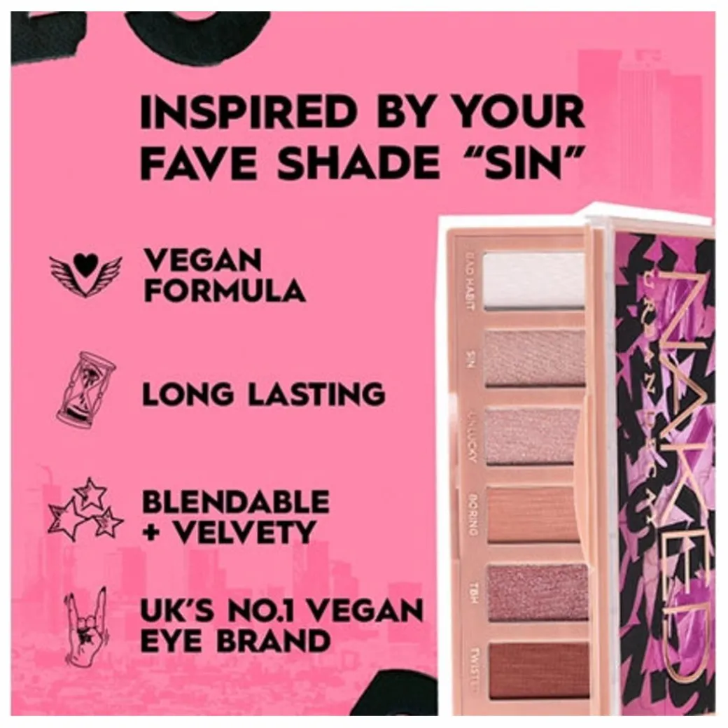 - Housed in a mini palette with a pink metallic ‘Sin’ design.