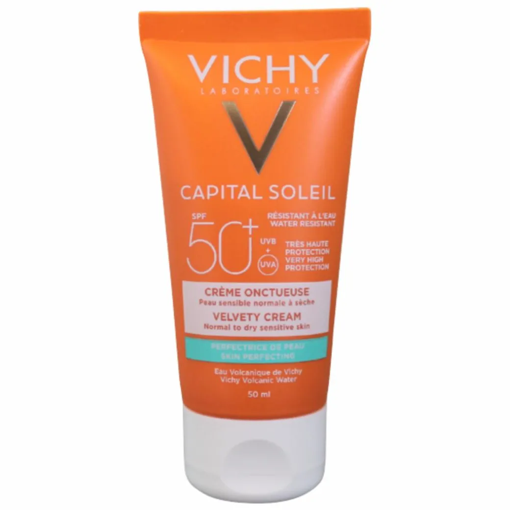 Protect your dry and sensitive skin from UV rays with the Vichy Capital Soleil Velvety Cream SPF 50+, a skin perfecting, creamy formula.