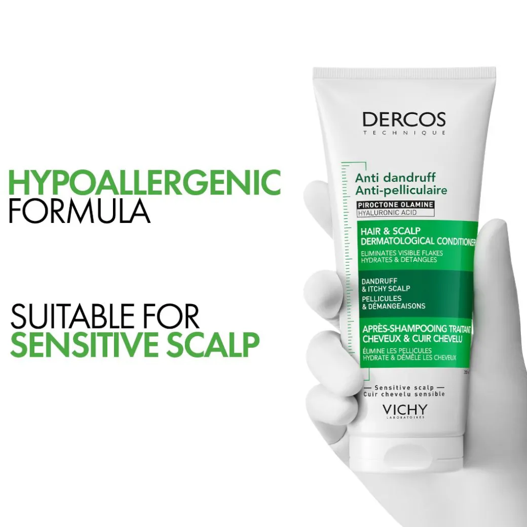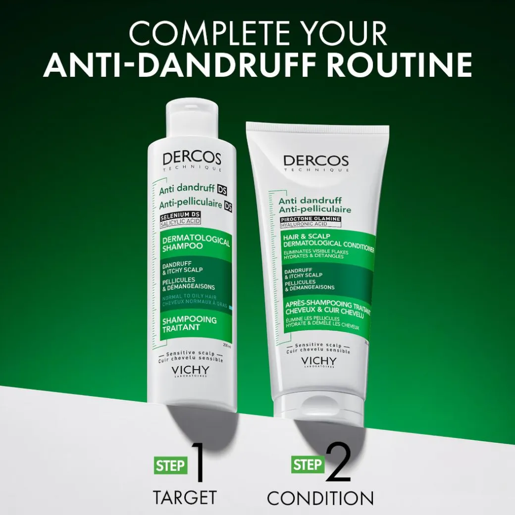 Discover Vichy Dercos Hair & Scalp Dermatological Conditioner to eliminate 77% of visible dandruff* and reduce itching by 92%*.