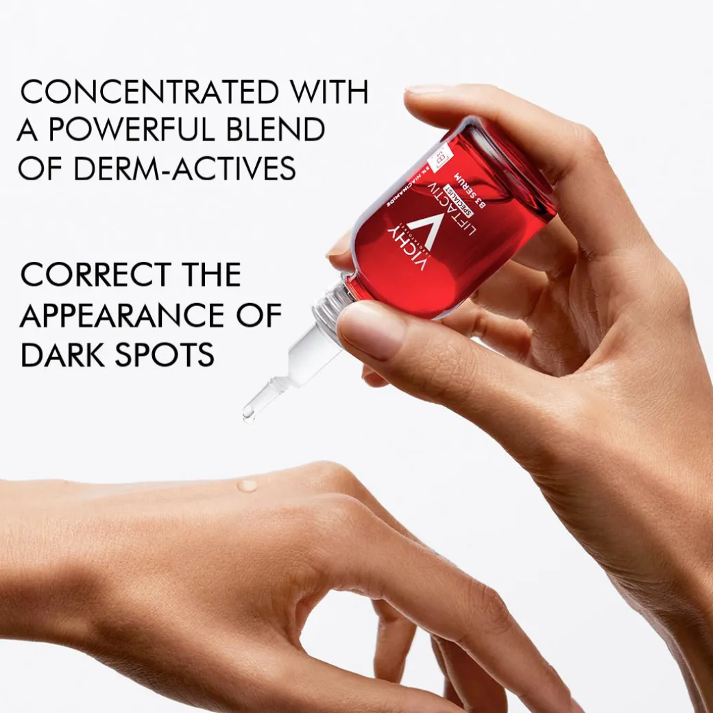 Exposure to various external factors, such as pollution and UV, can impact skin over time: collagen production declines by 75% and pigment spots can increase by up to 20%. Liftactiv Specialist 5% Niacinamide B3 & AHA Complex Dark Spots & Pigmentation Serum is powered with synergetic actives for a 360 action against dark spots and wrinkles. Formulated with 5% Niacinamide, Vitamin CG and Glycolic acid, the serum helps improve the appearance of epidermal dark spots and wrinkles and leaves skin tone looking more even. Contains no alcohol, fragrance or silicones. This powerful serum is carefully formulated to be hypoallergenic and suitable for multi-phytotypes.