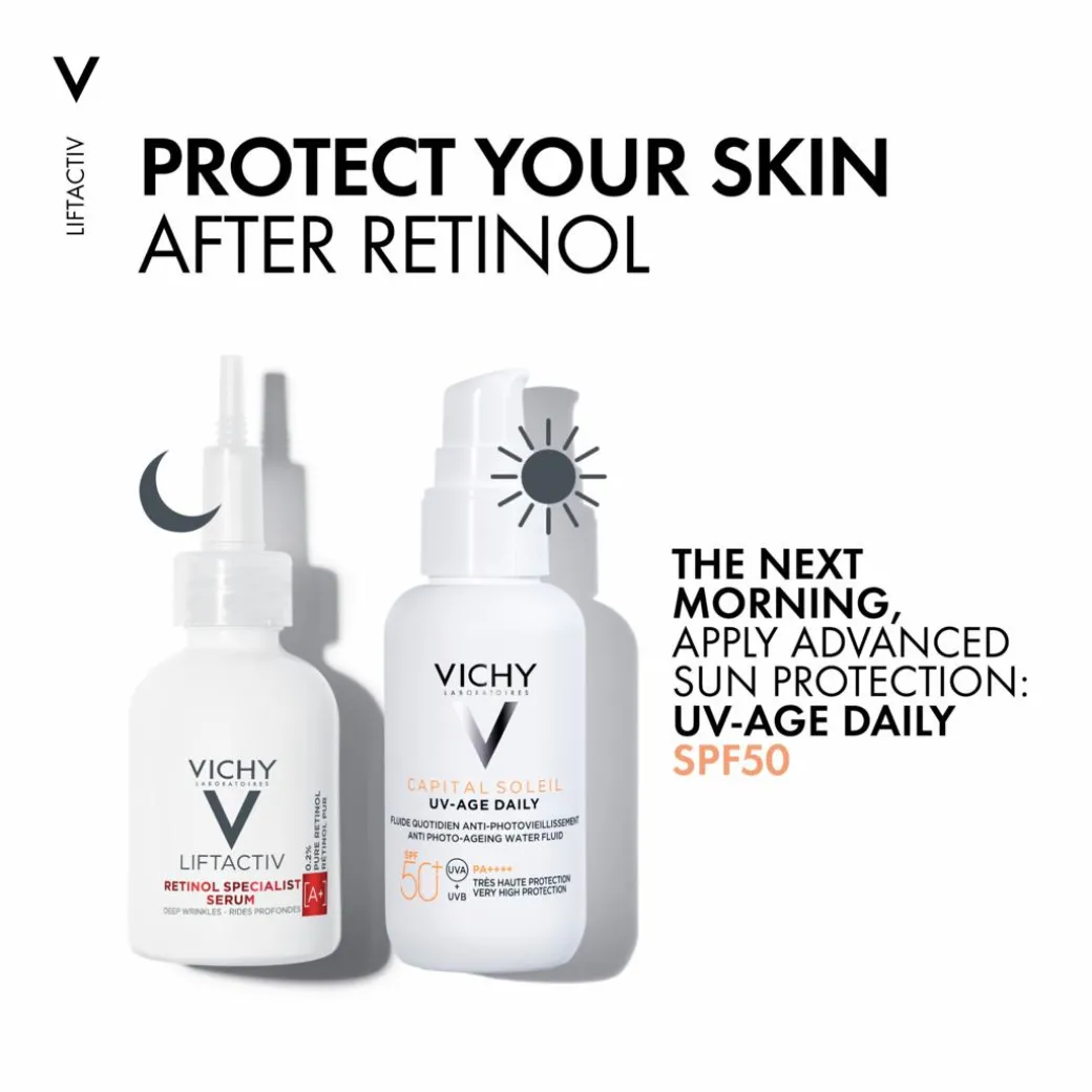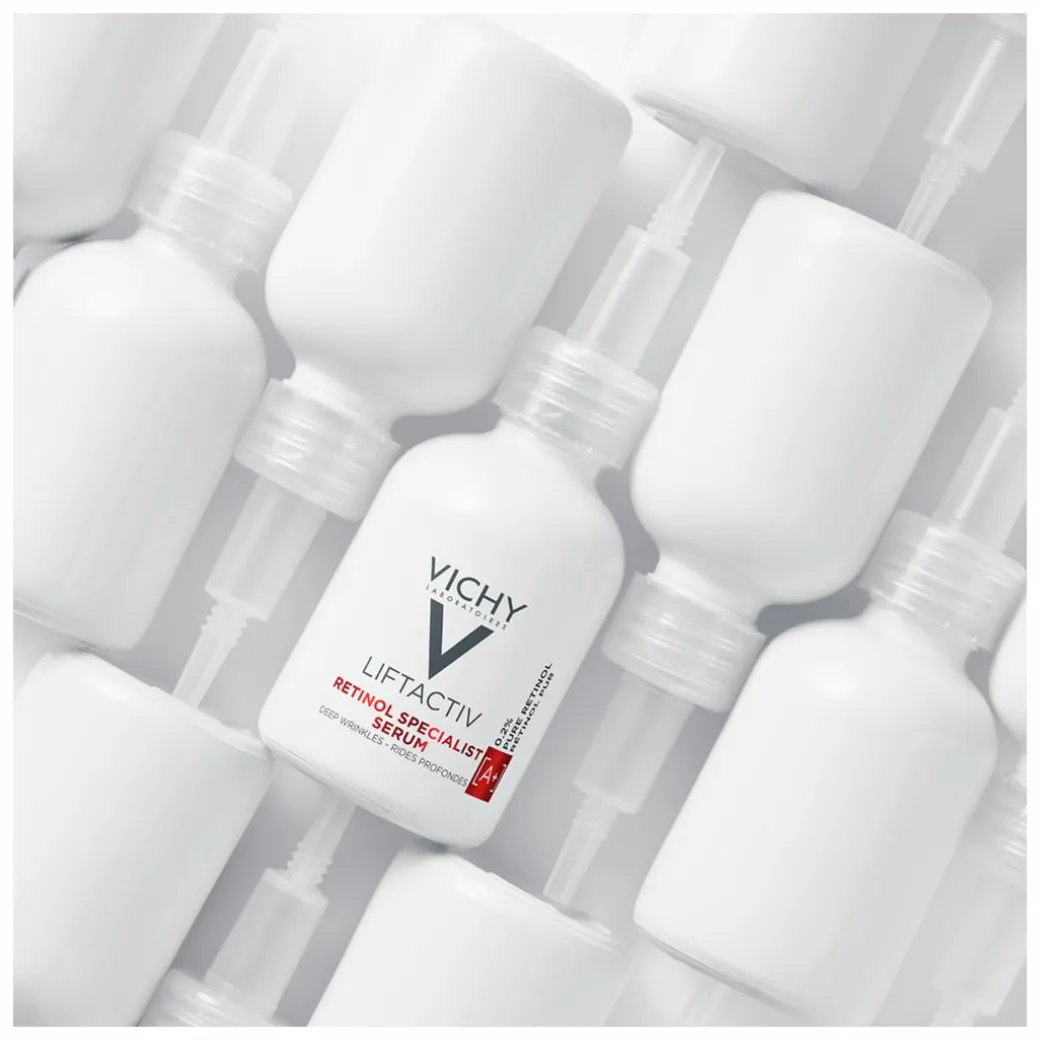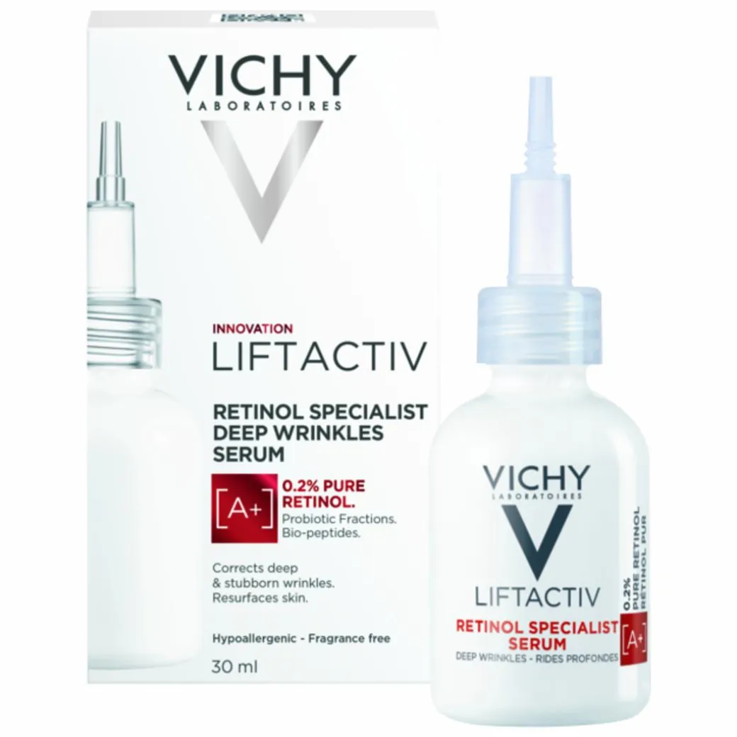 Natural ageing and external aggressors can decrease your skin cell renewal resulting in stubborn wrinkles and deep fine lines. Vichy has created the solution with the Liftactiv Retinol Specialist Deep Wrinkle Serum, designed to reduce wrinkles and deep fine lines whilst smoothing skin tone and boosting radiance for a healthy and youthful complexion. Formulated with 0.2% pure retinol to exfoliate your skin and increases collagen production for a firmer, supple and radiant complexion. The formula is amplified by 1% probiotic-derived fractions (cultured bacterial lysate) known for their skin-repairing properties and bio-peptides for amplified anti-ageing results.