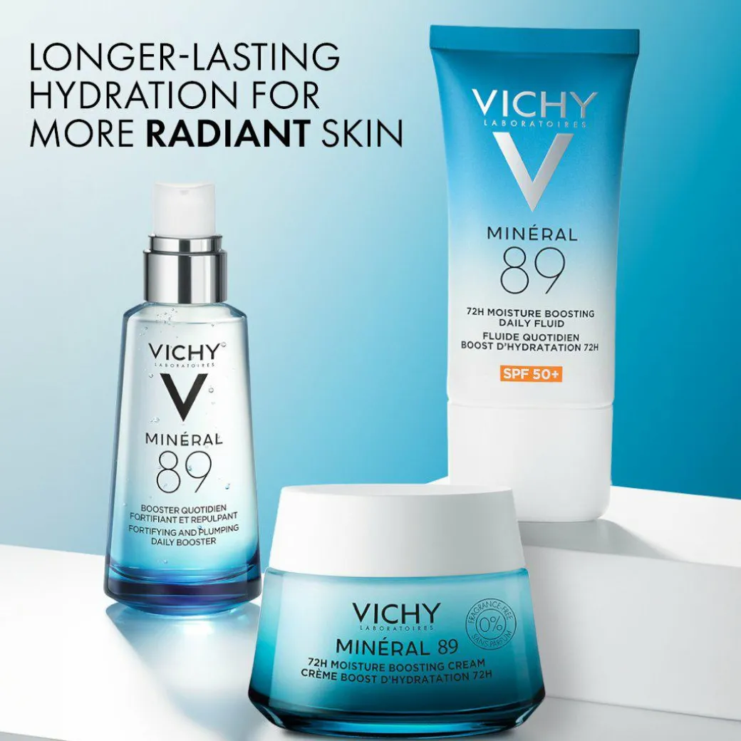 Discover NEW Vichy Minéral 89 72H Moisture Boosting Daily Fluid SPF50+ with pure Hyaluronic Acid, which protects your skin against UVA & UVB rays and boosts hydration for up to 72h. Daily exposure to UV rays weakens the skin’s moisture barrier; to help combat this, Vichy formulated this SPF50+ fluid with Hyaluronic Acid, Vichy Volcanic Water Mineral, Vitamin B3 & E and Squalane.