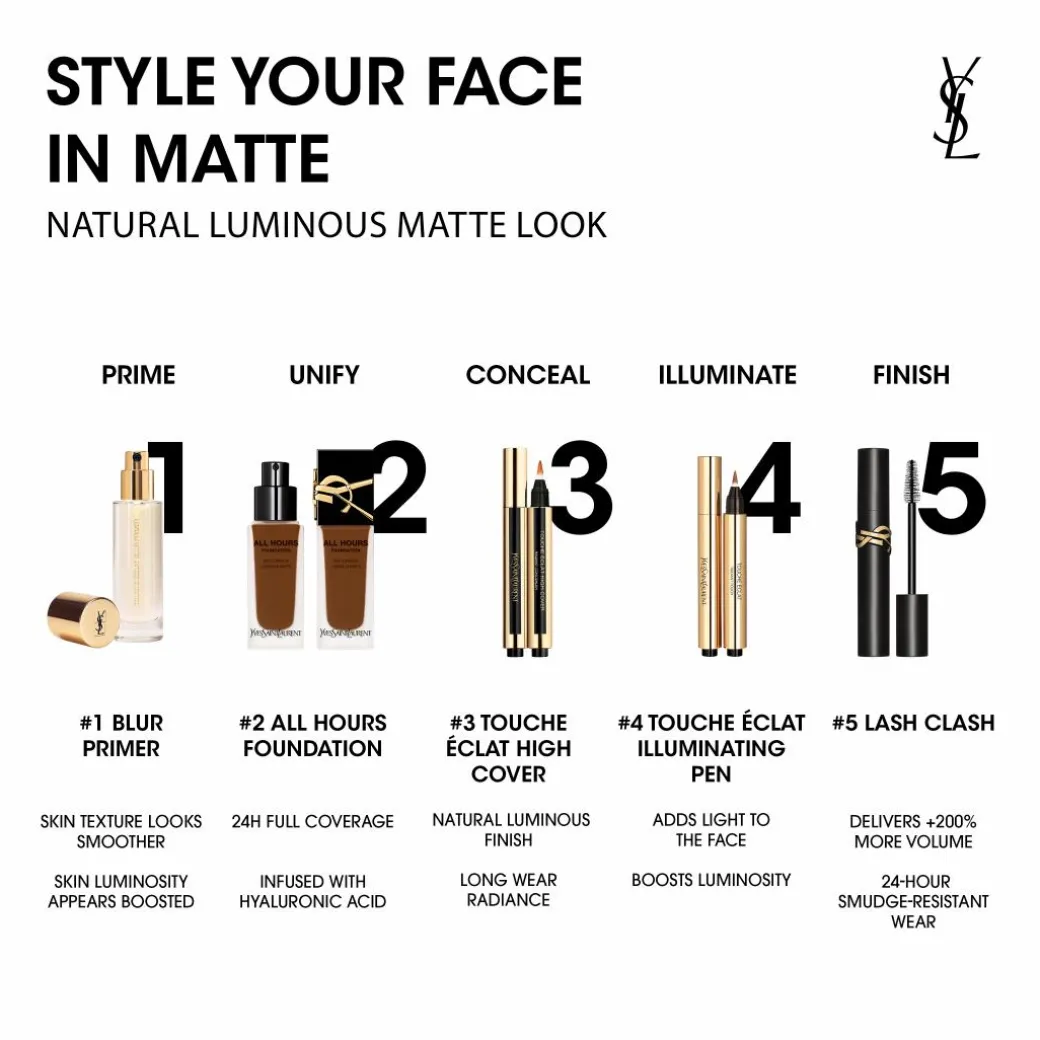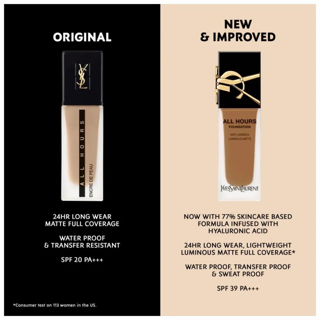 Available in a diverse range of shades, every skin tone can enjoy a softer, smoother and hydrated complexion with the skin-loving foundation formula. Infused with hyaluronic acid, the YSL All Hours Foundation provides all-day hydration for a comfortable, luminous finish. Added neo-skin powder keeps your complexion shine-free, while jasmine petals sourced from the YSL Ourika Gardens help combat any dullness.